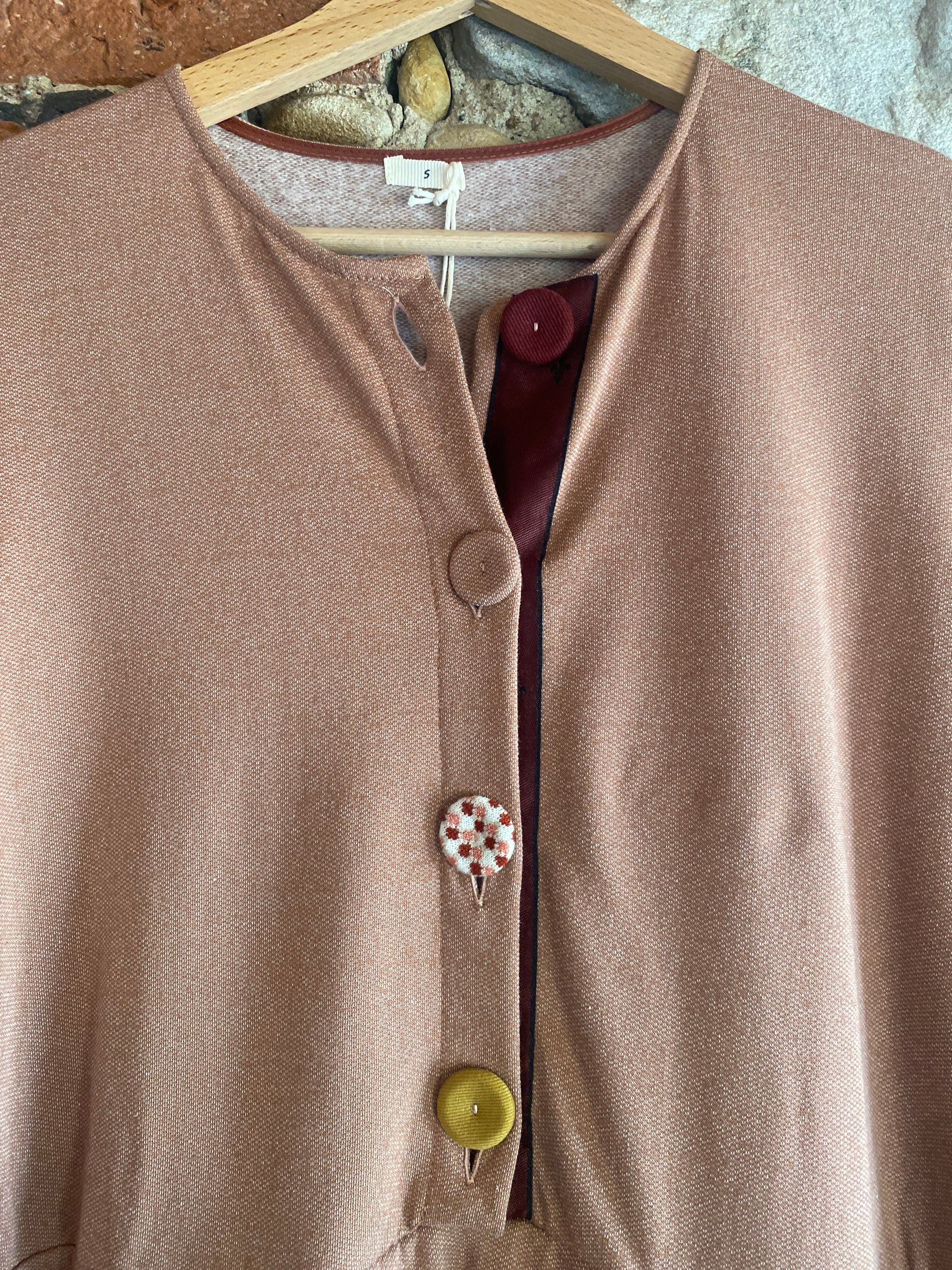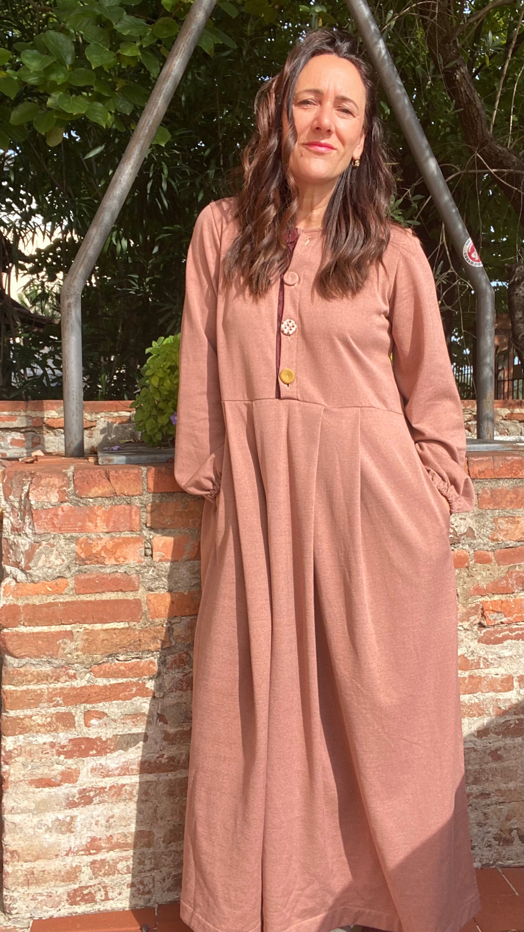 Modello con scollo rotondo e apertura davanti con quattro bottoni rivestiti di stoffa colorati, manica lunga con elastico al polsino, dalla vita in giù l’abito si allarga leggermente.