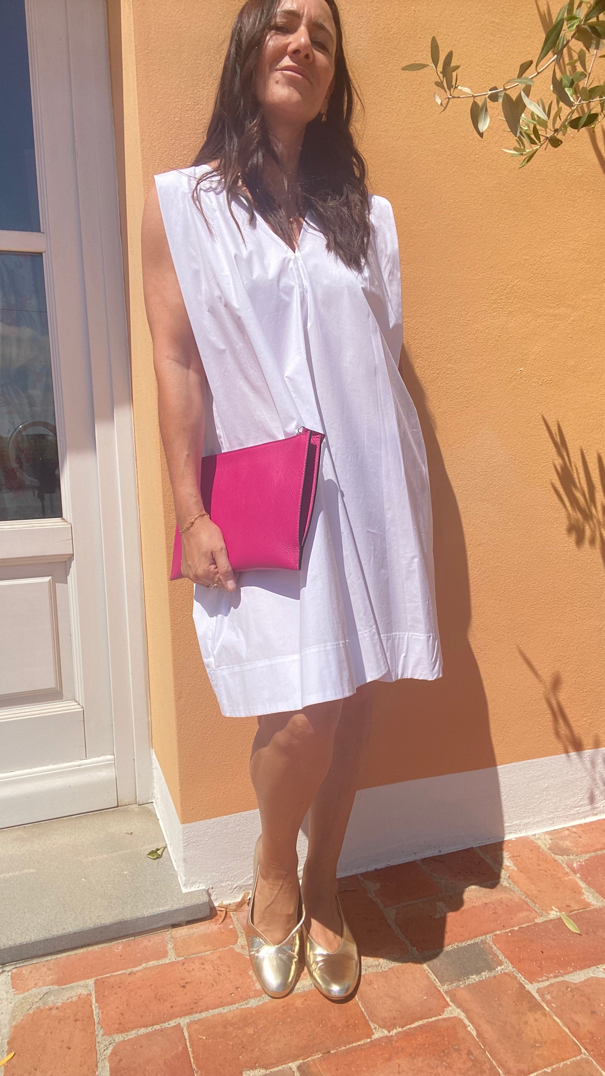 Modello a trapezio spalla larga, si va ad allargare dolcemente verso il fondo, laccetto dietro per regolare la scollatura .