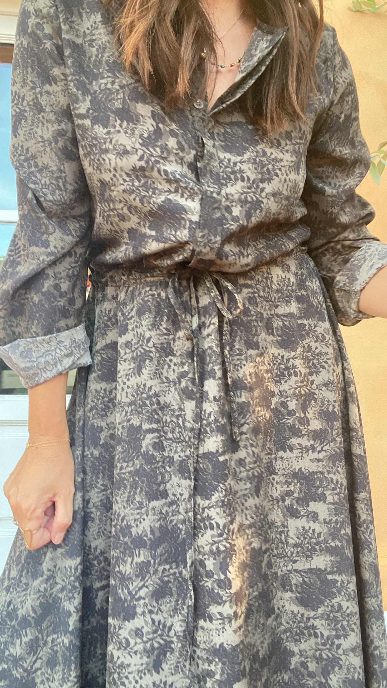 Modello con scollo rotondo e apertura sul davanti con cinque bottoncini, coulisse in vita per regolare la larghezza, manica lunga con bottoncino al polsino sotto gonna foderata.