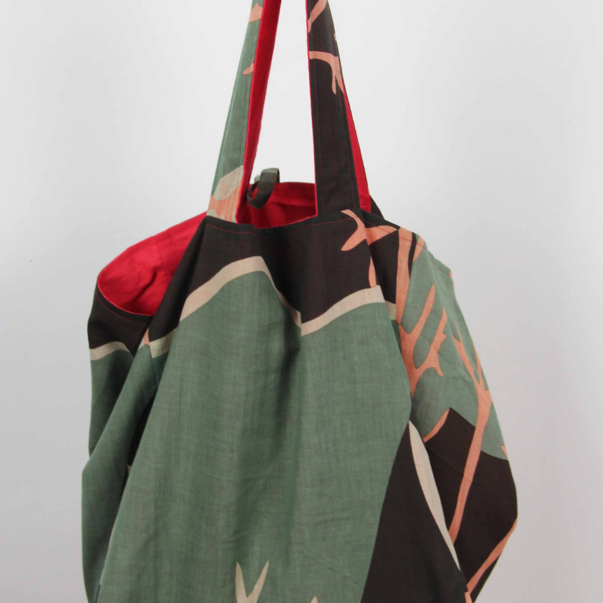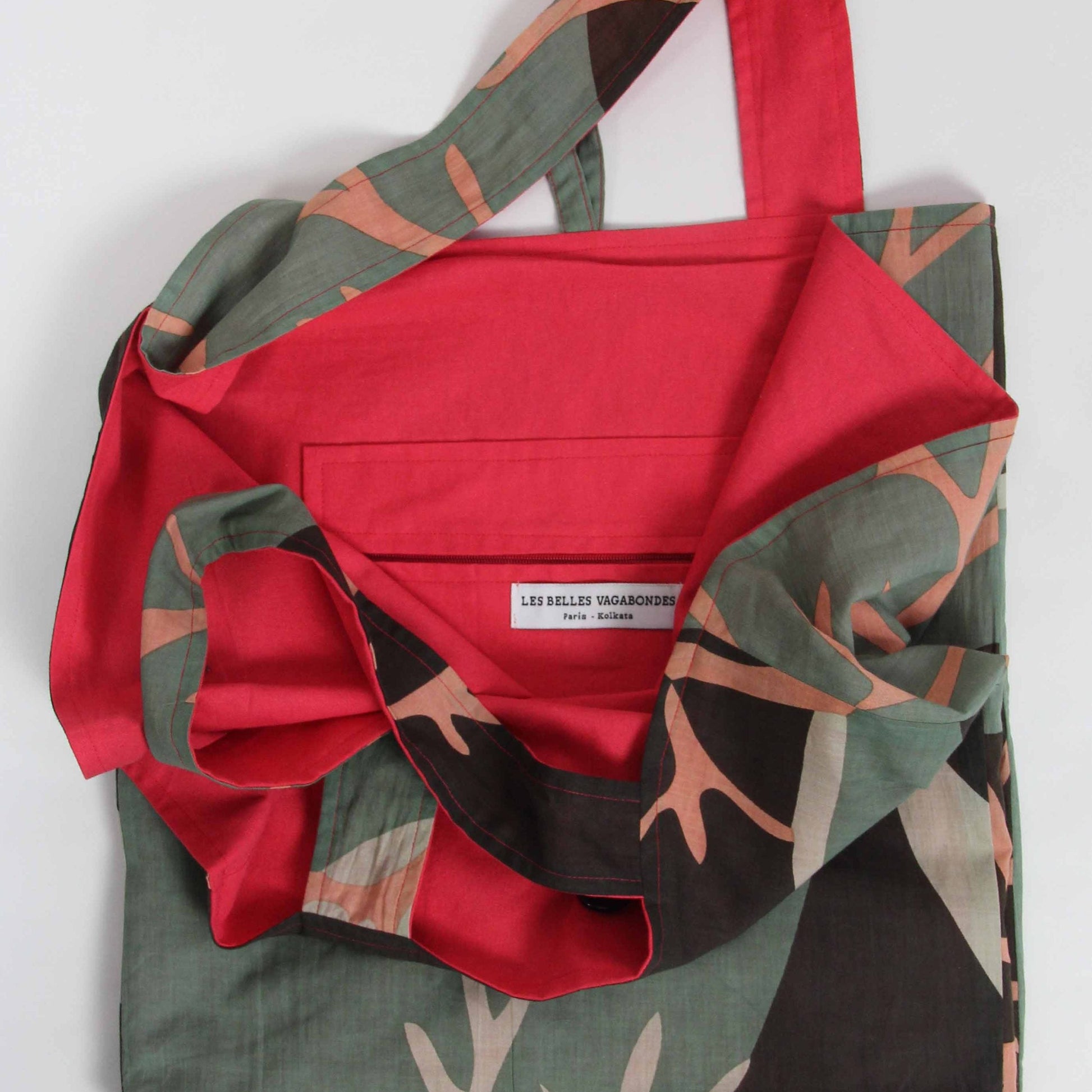 Borsa tote XL in cotone organico (33×33 cm) creata con ritagli di tessuto. Queste borse sono state progettate riciclando i materiali tessili delle collezioni Les Belles Vagabondes e propongono tote bag colorate e reversibili.