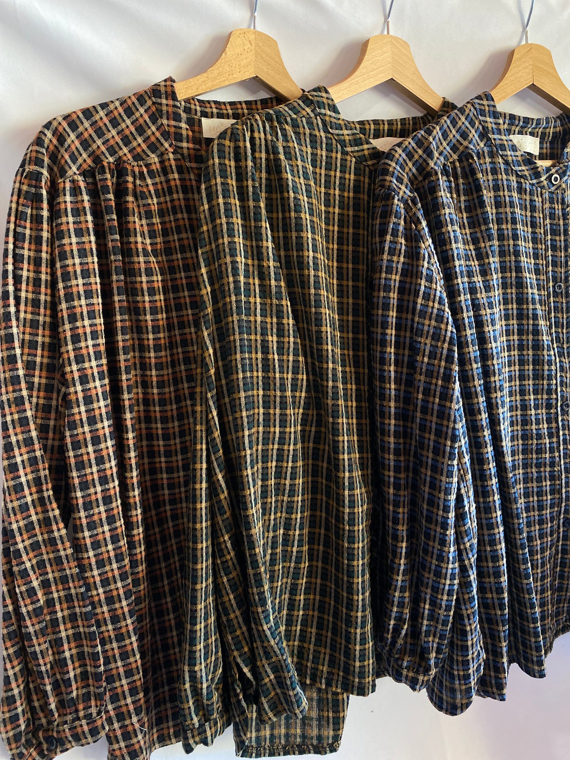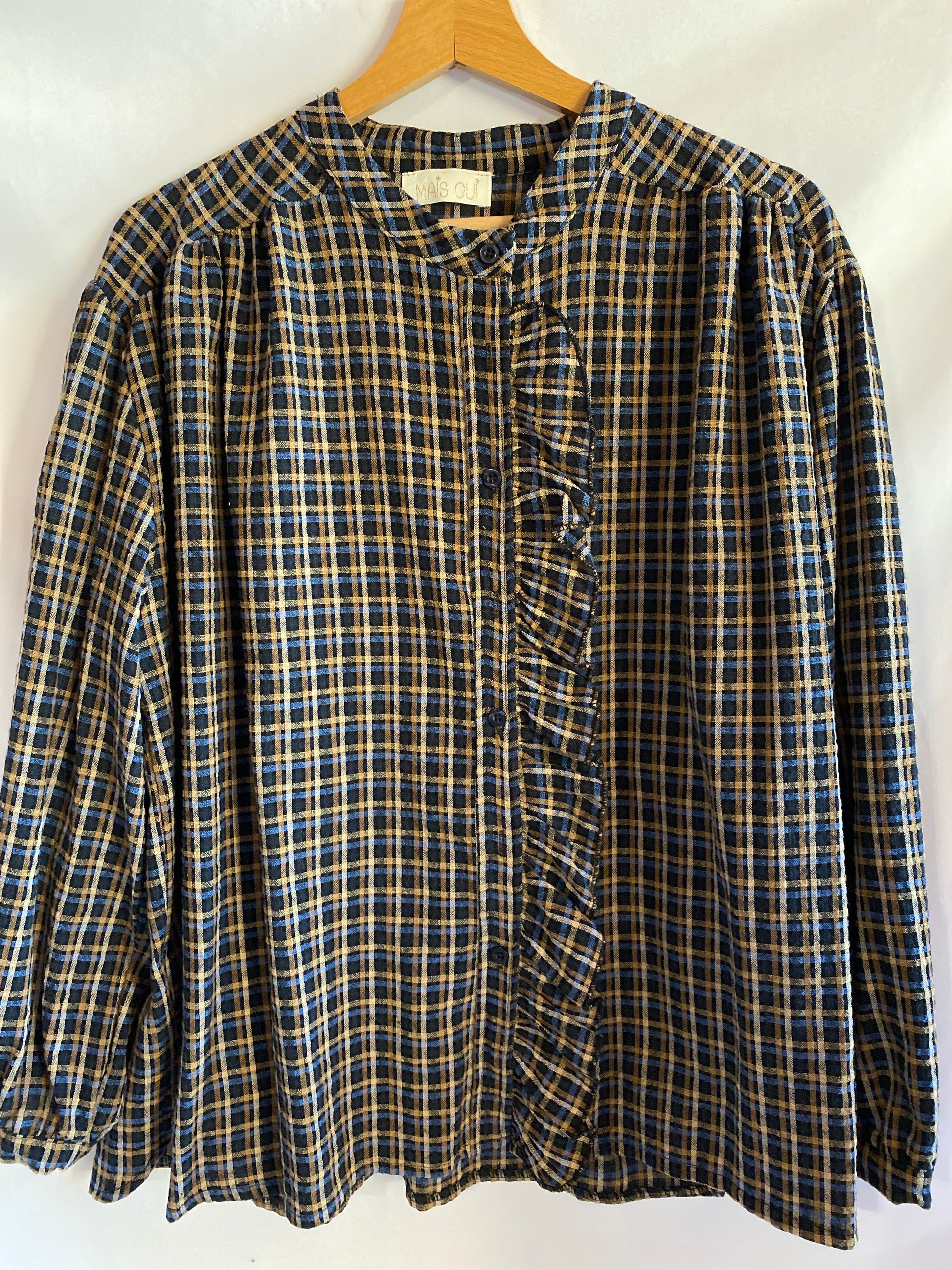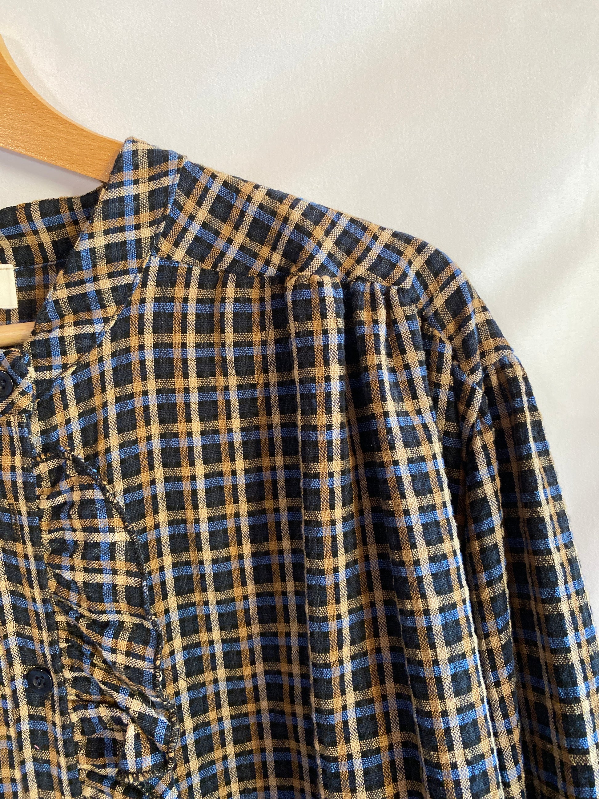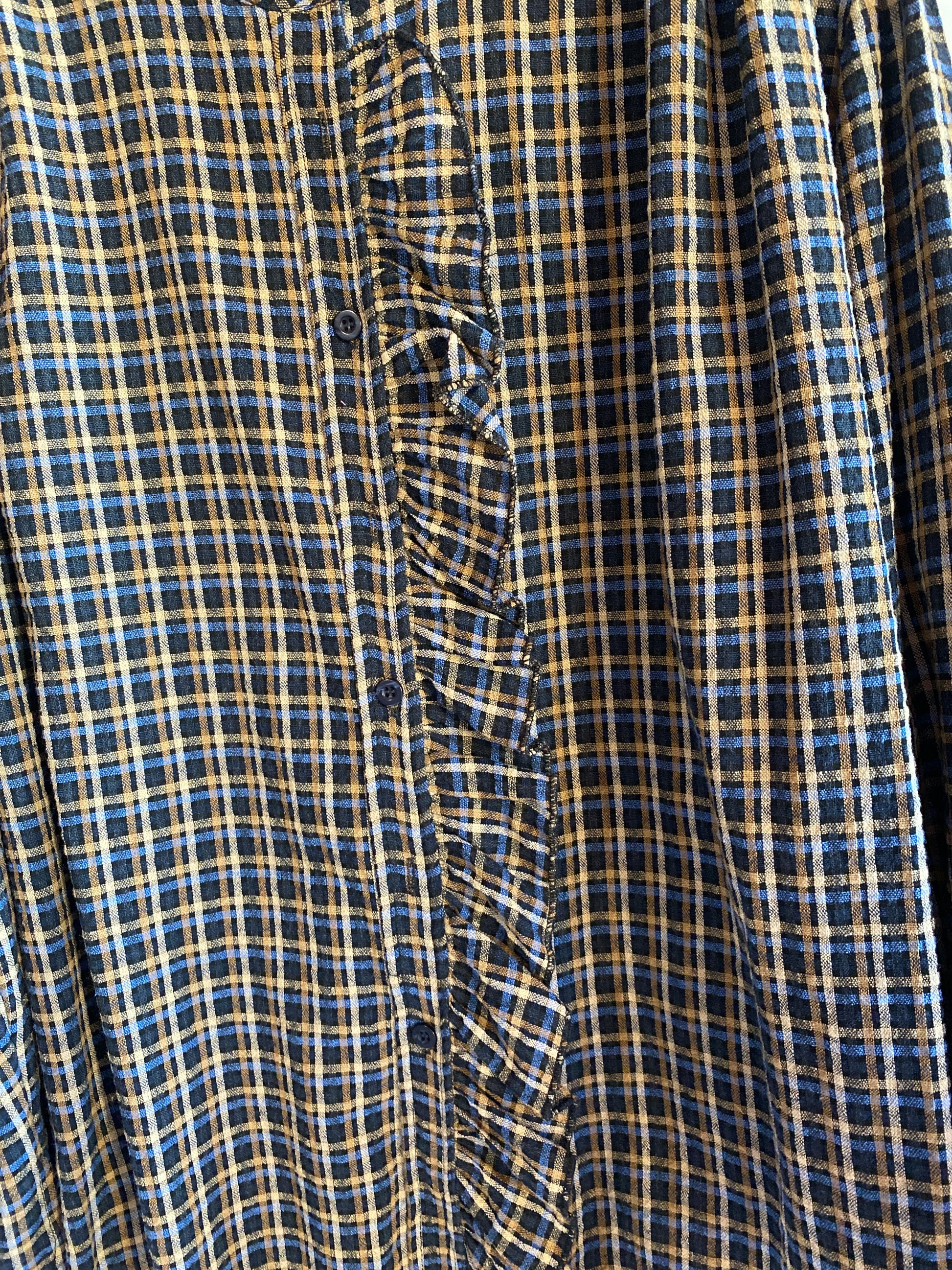 Modello collo serafino, volant applicato lungo la chiusura davanti, pence nella parte anteriore delle spalle, spacchetti al fondo e stondata.