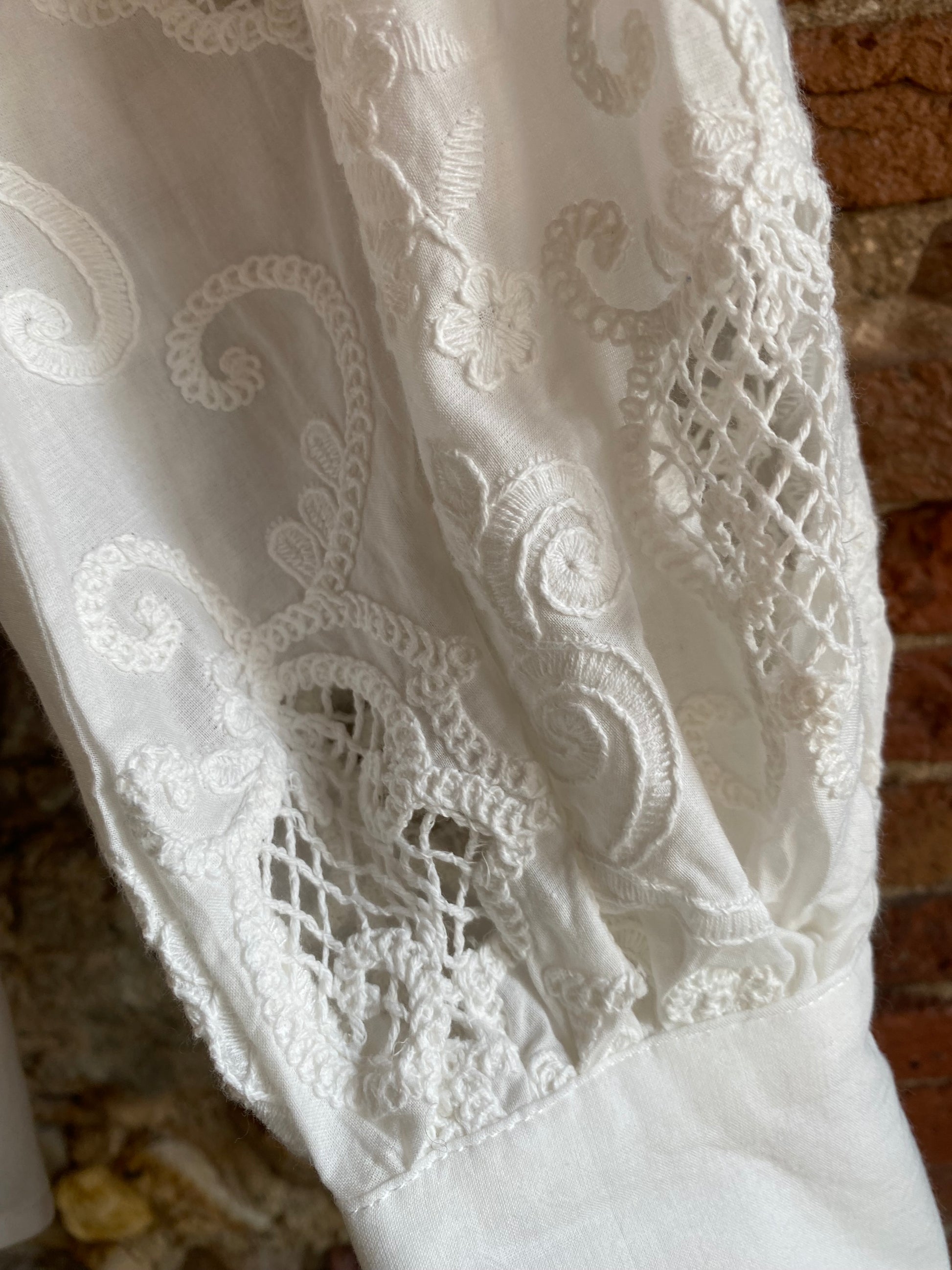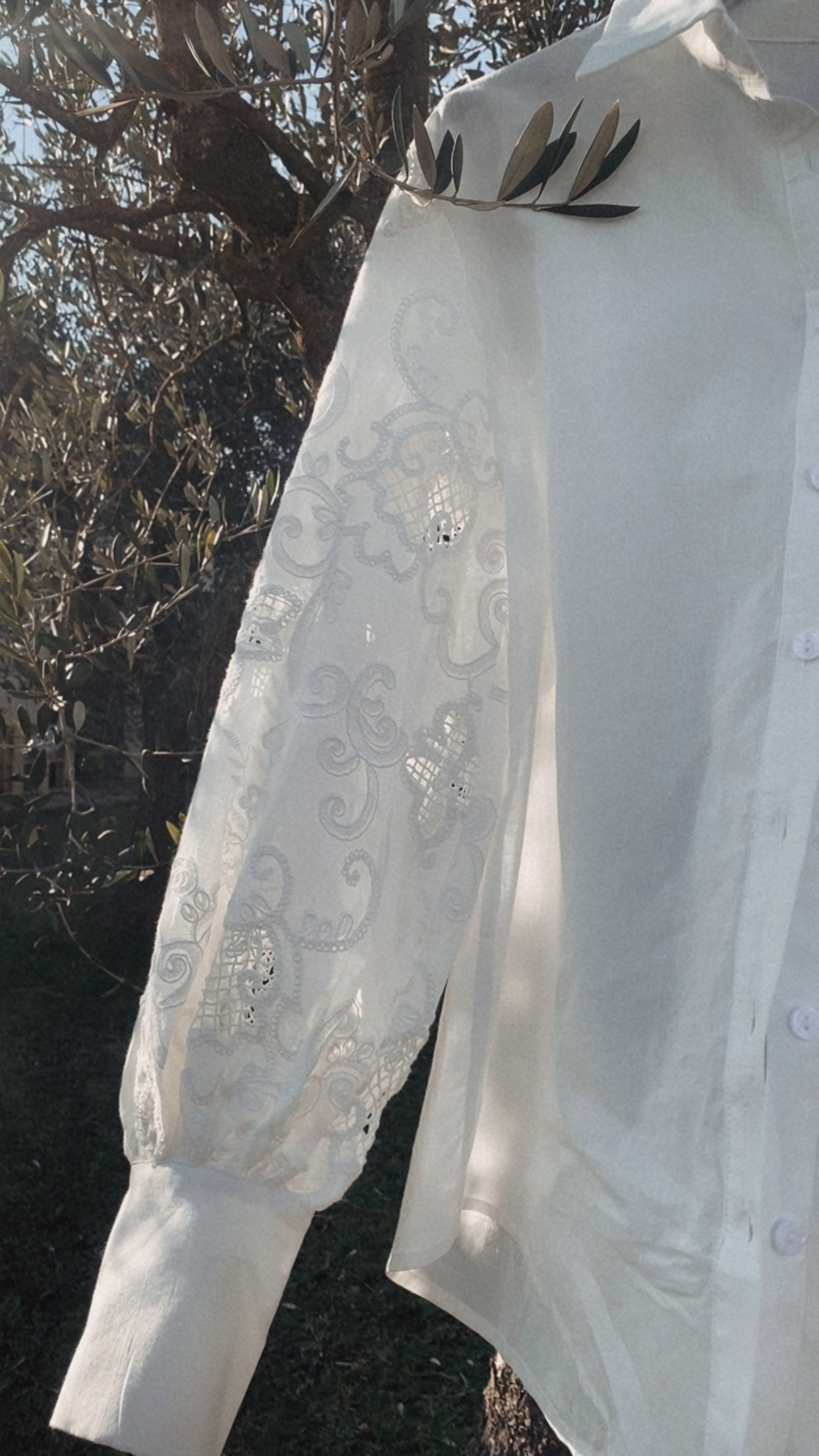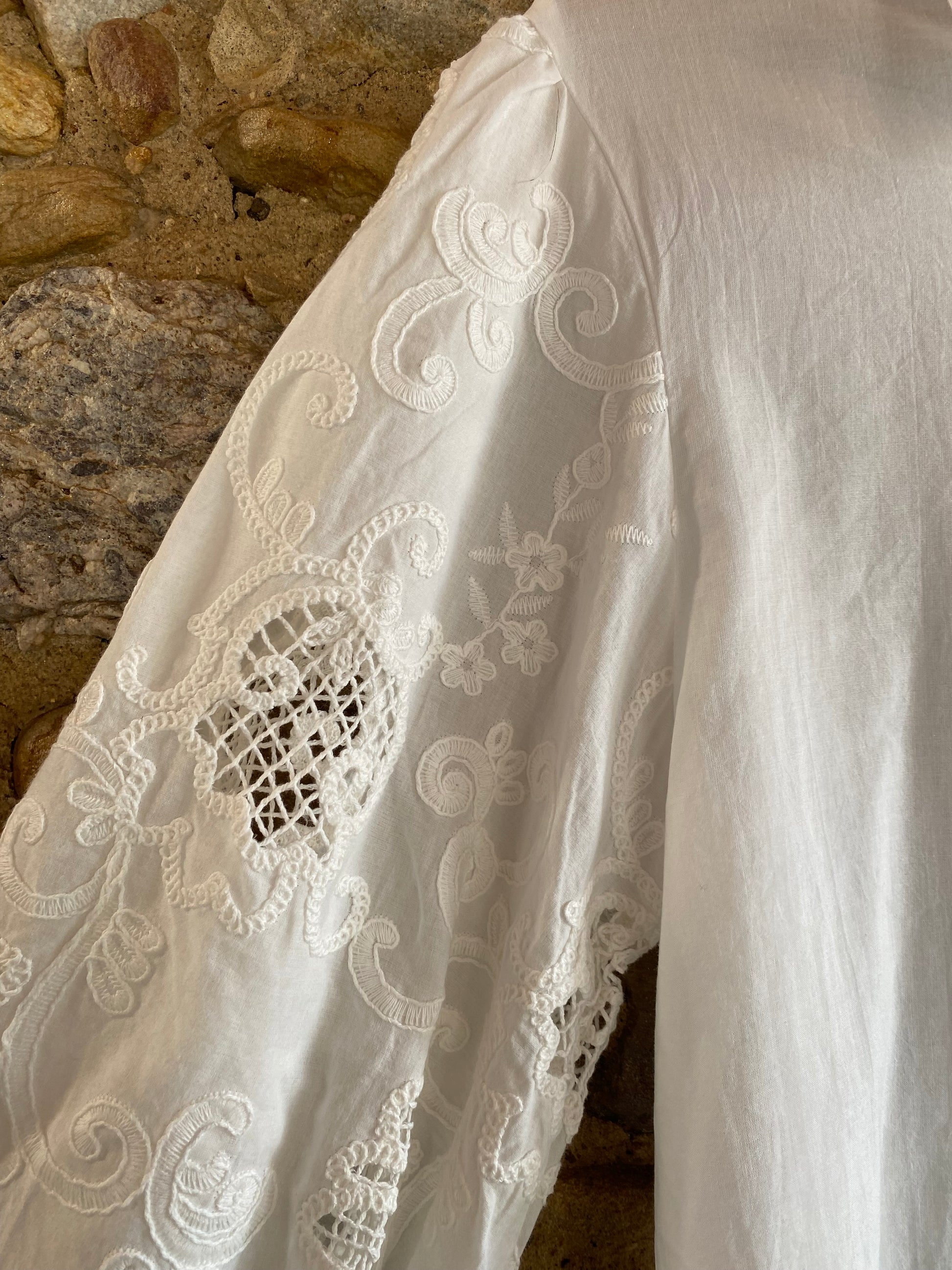 • Maniche ampie con ricami tono su tono che valorizzano il capo