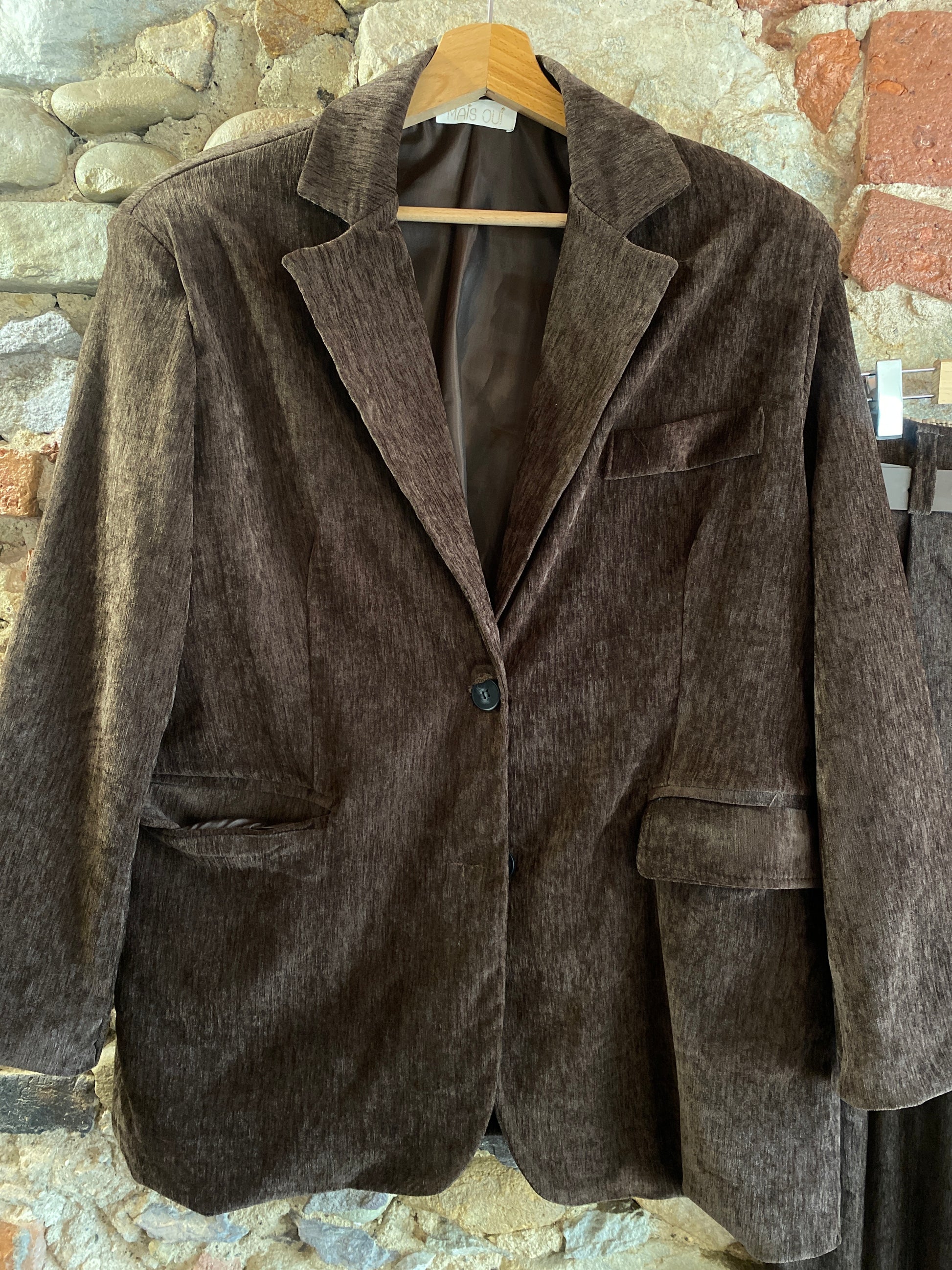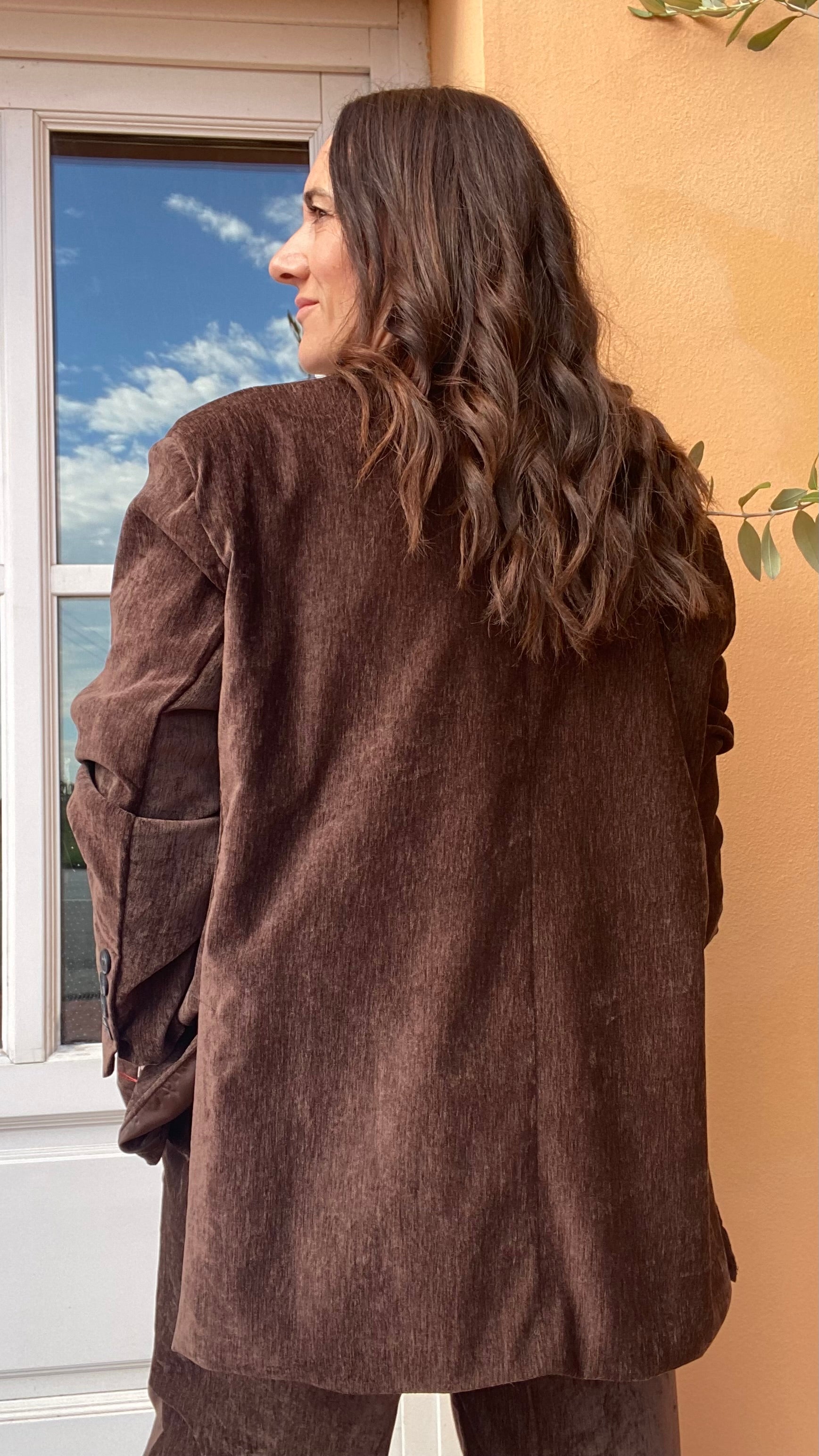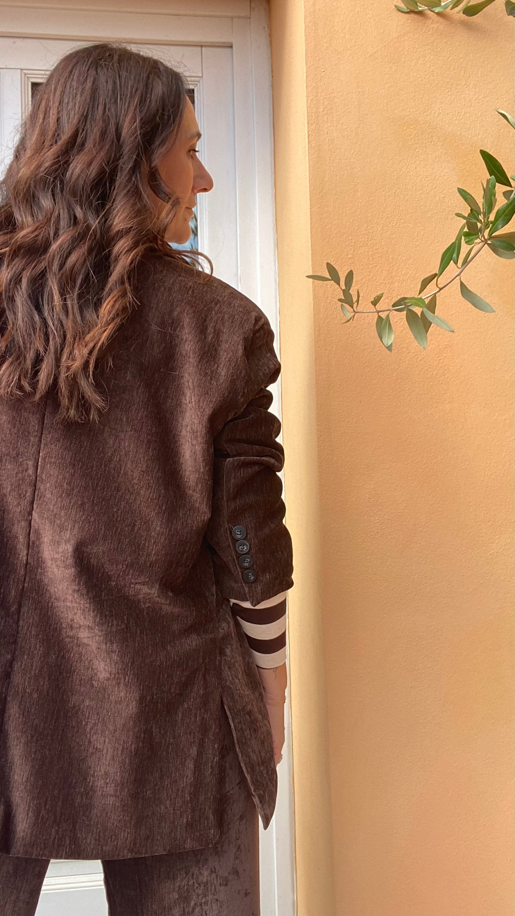 Giacca monopetto, chiusura con due bottoni, tasche laterali con patta, al polsino quattro bottoni per apertura, collo con reverse e spalline imbottite, fodera interna colore bordeaux, la giacca a due spacchi laterali nella parte posteriore per dare movimento.