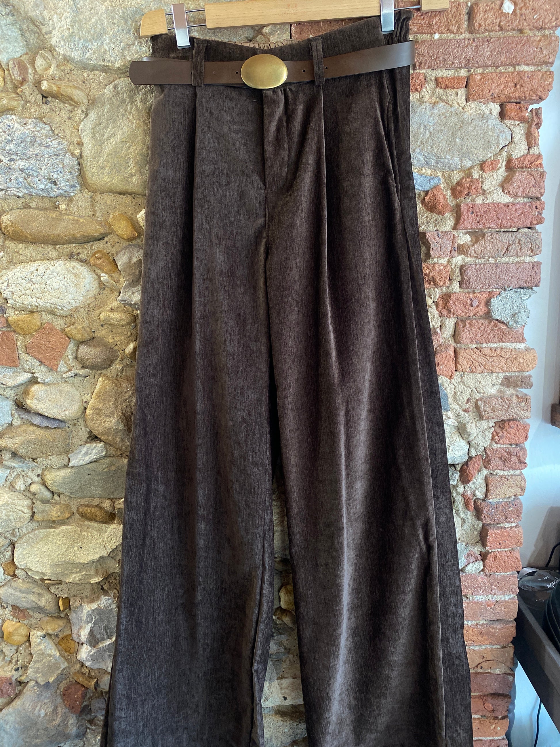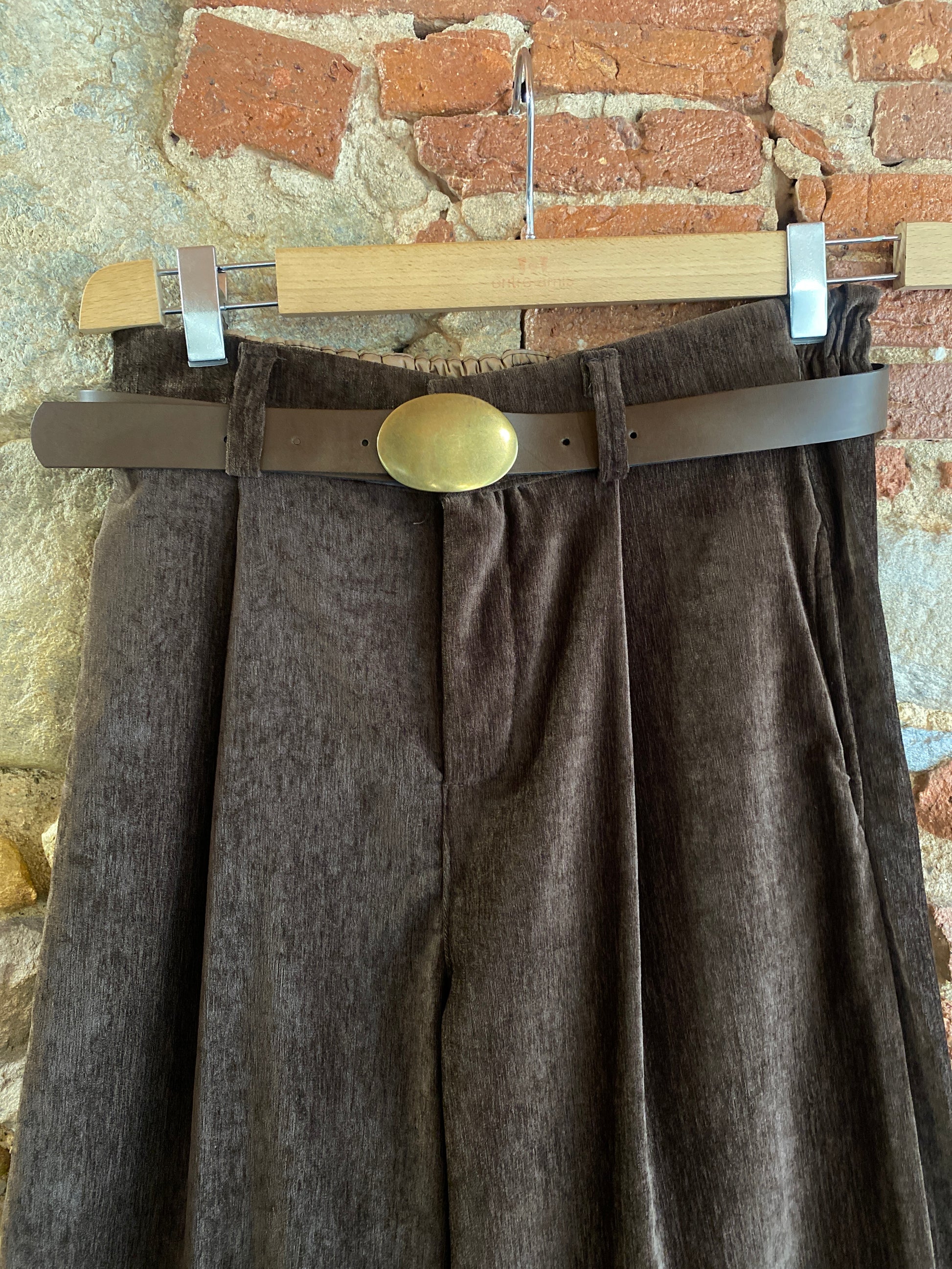 Pantaloni con elastico nella parte posteriore chiusura davanti con bottoni cerniera, passanti in vita e cintura compresa, tasche laterali, gamba dritta.
