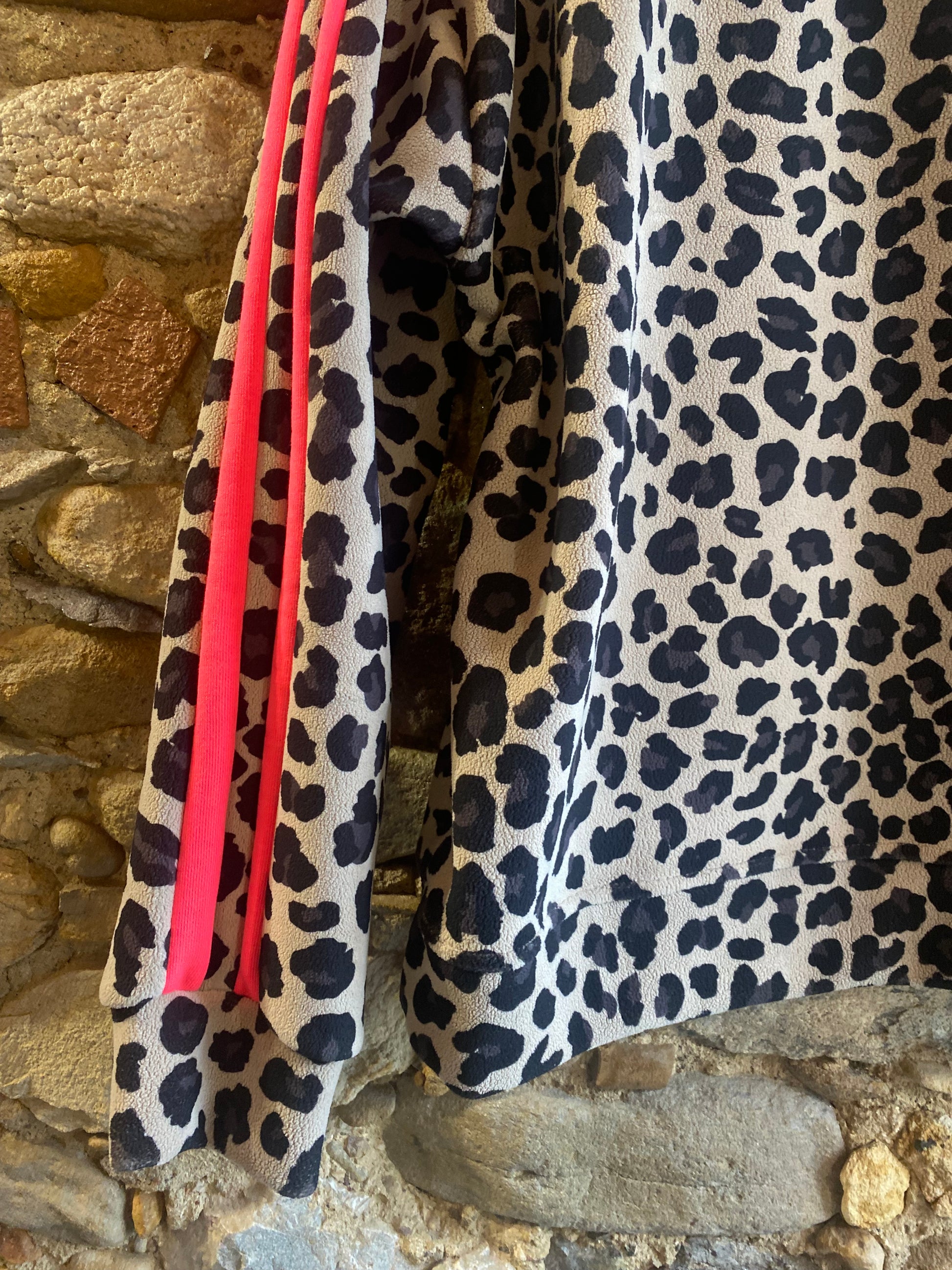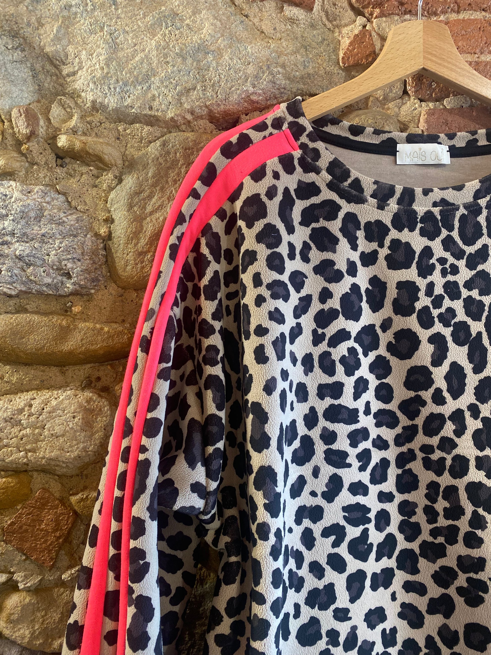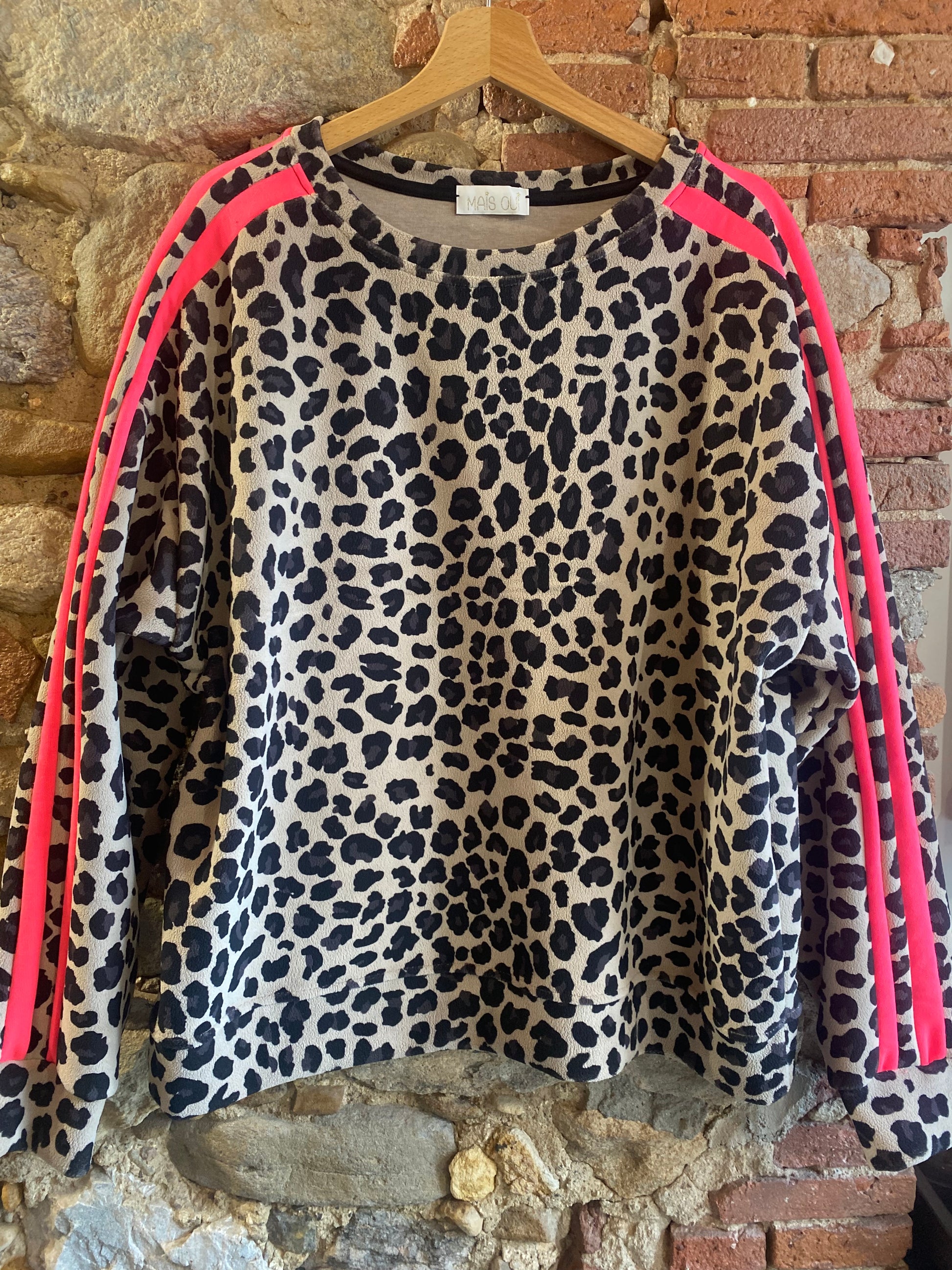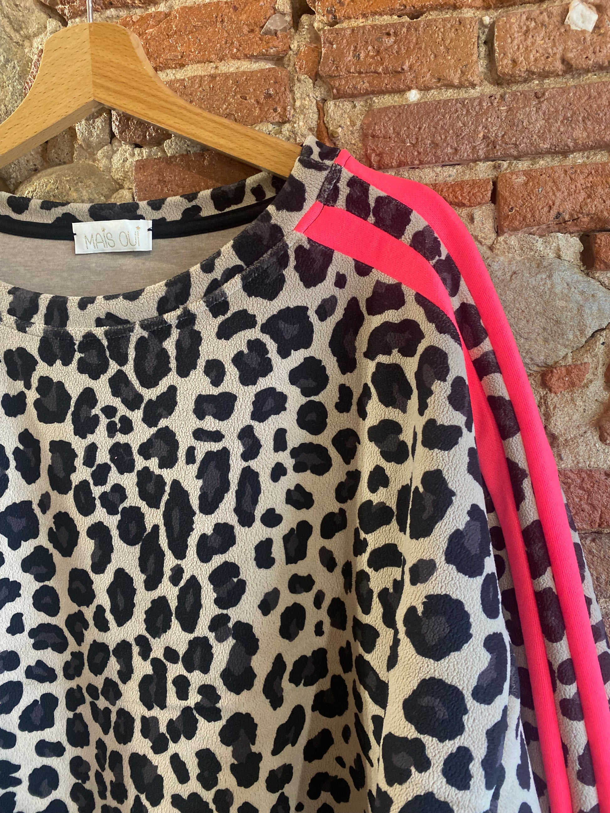 Felpa in morbido tessuto simil pile con stampa animalier e bande laterali fucsia fluo, su base tortora, che aggiungono un tocco sportivo e deciso. Linea comoda, scollo rotondo e fondo dritto. Perfetta per dare carattere anche ai look più semplici, tra comfort e grinta.