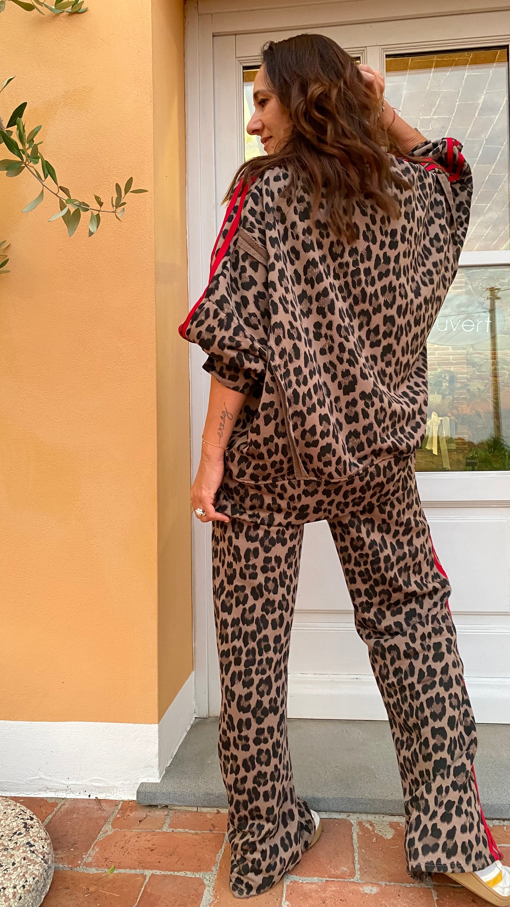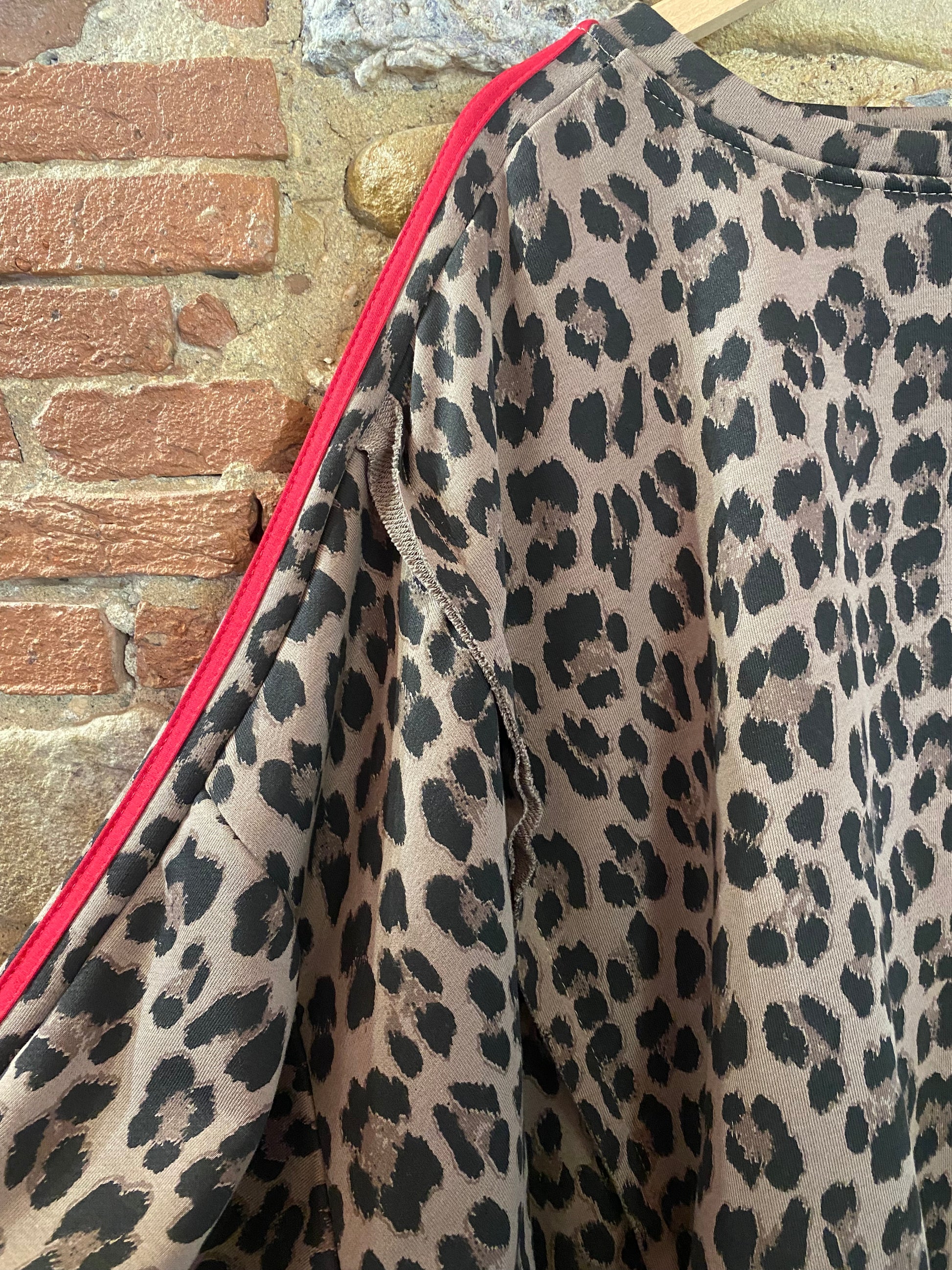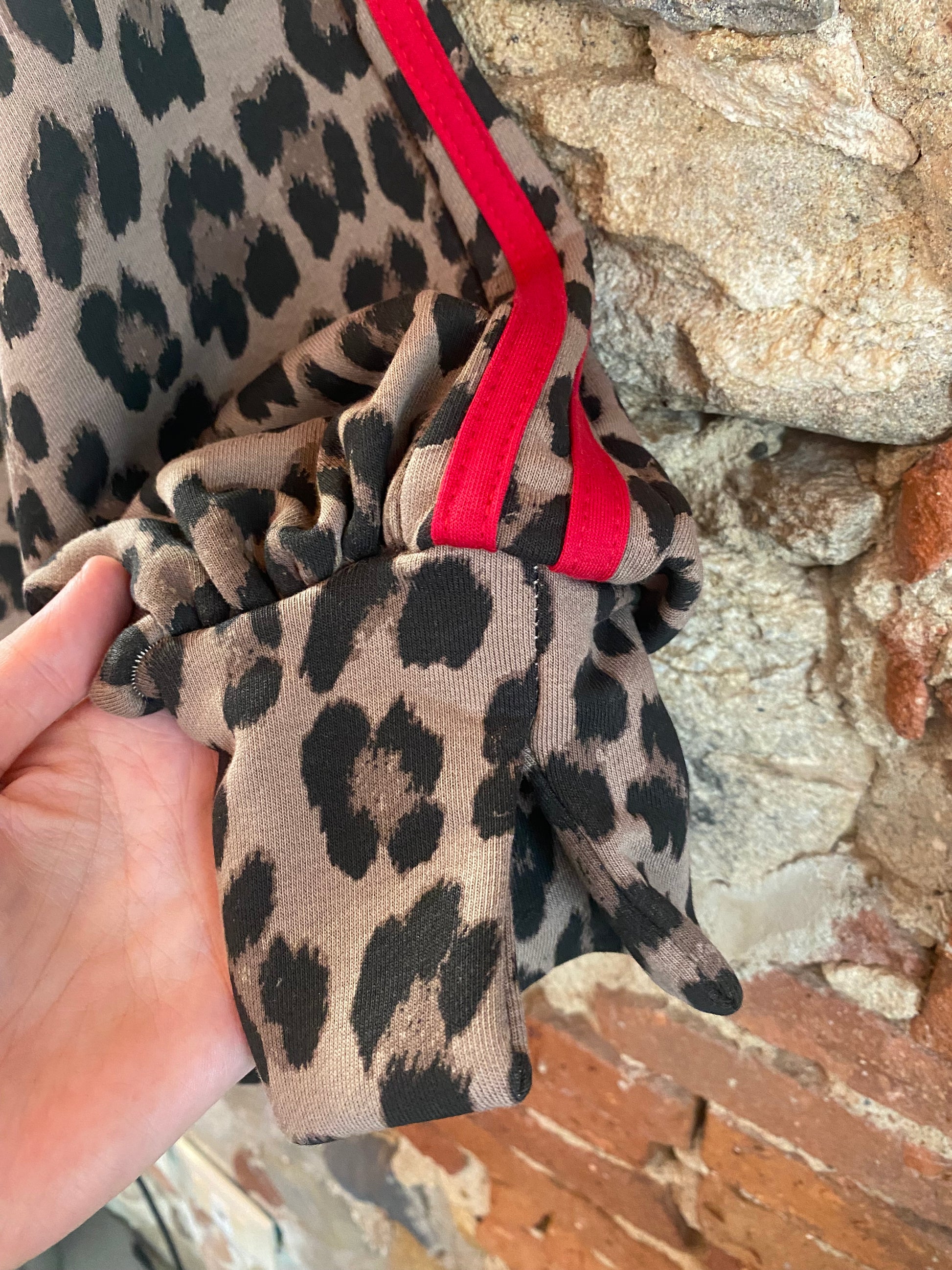 Bellissimo completo in fantasia maculata con rifiniture rosse.