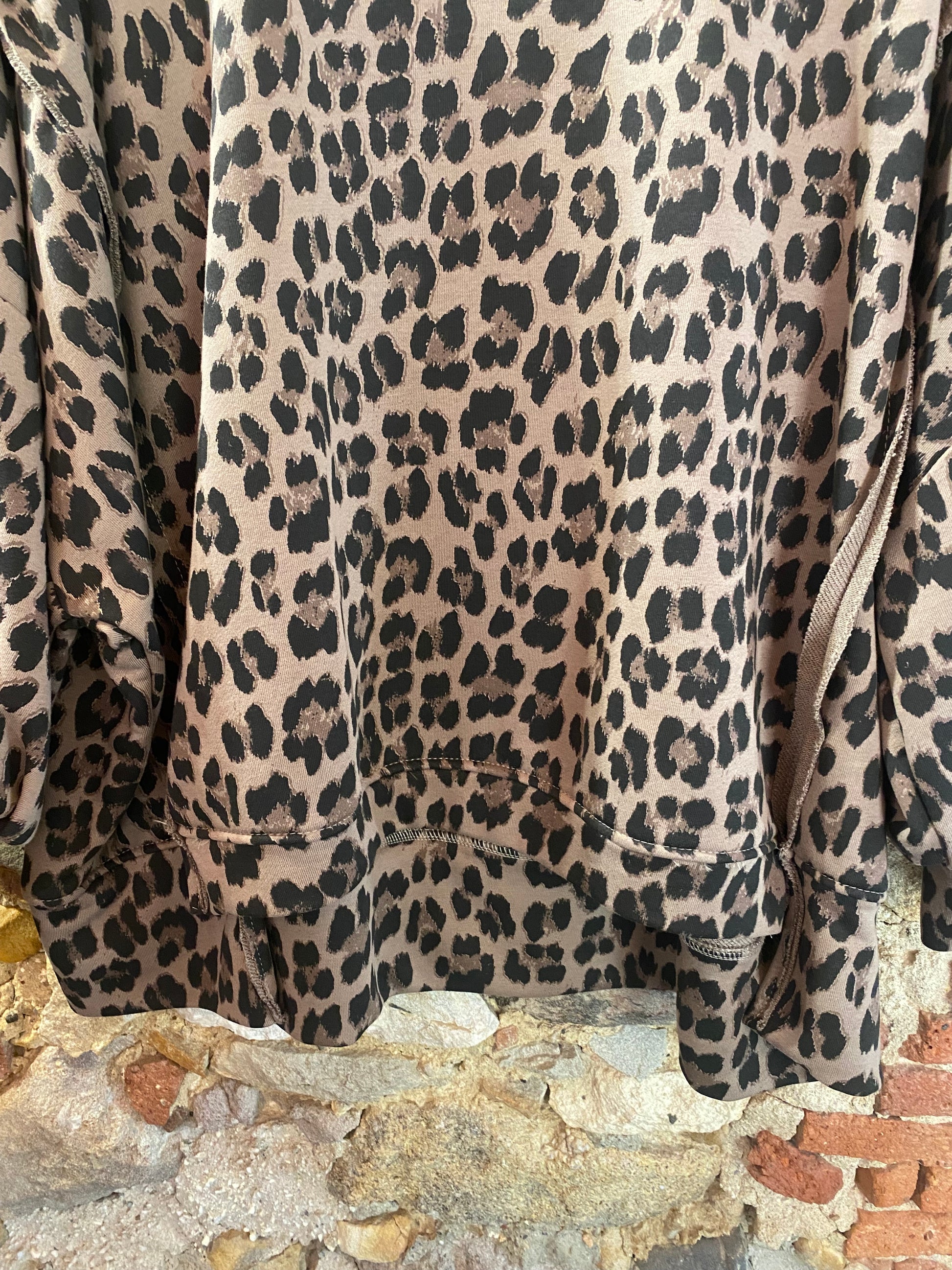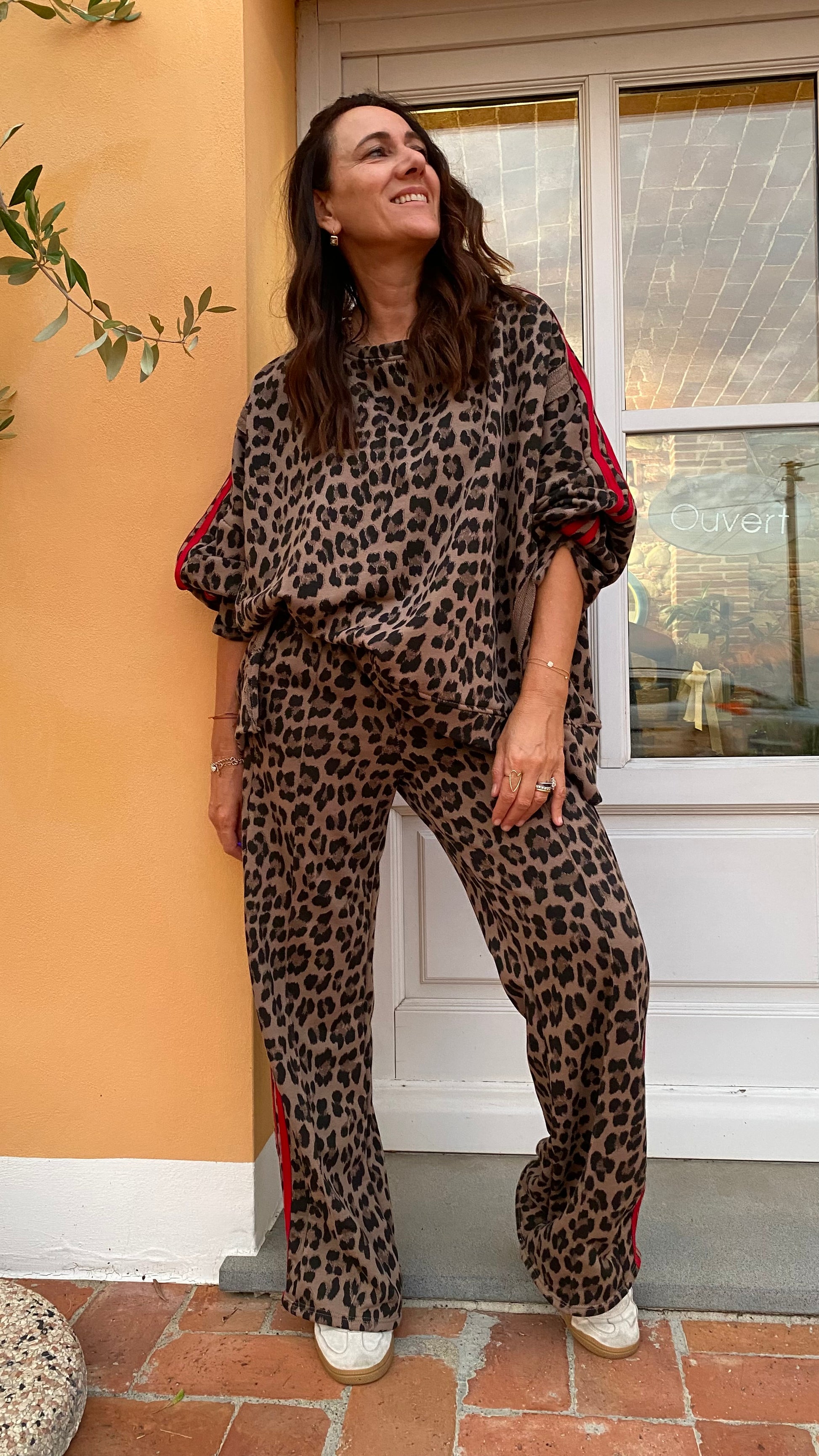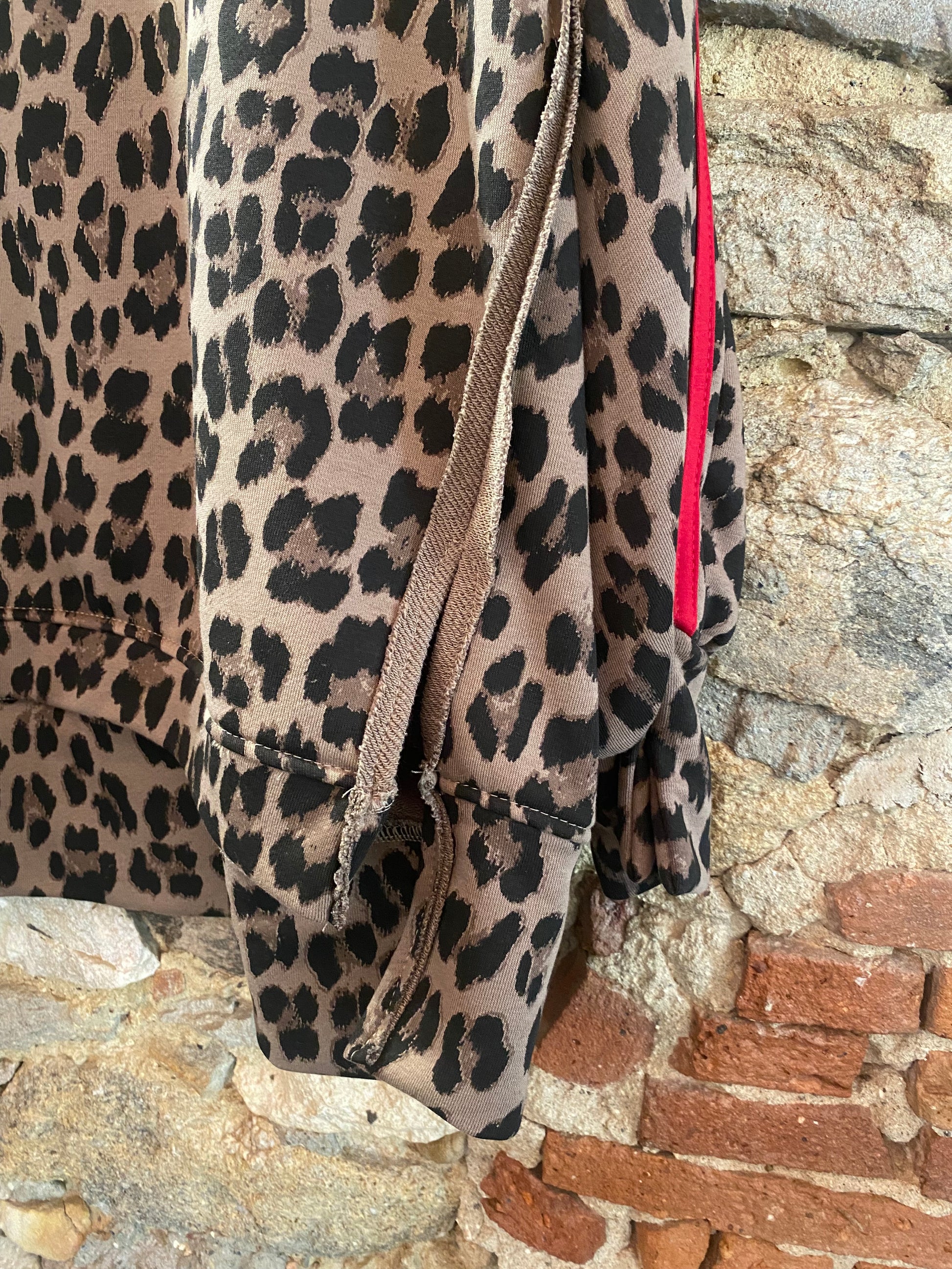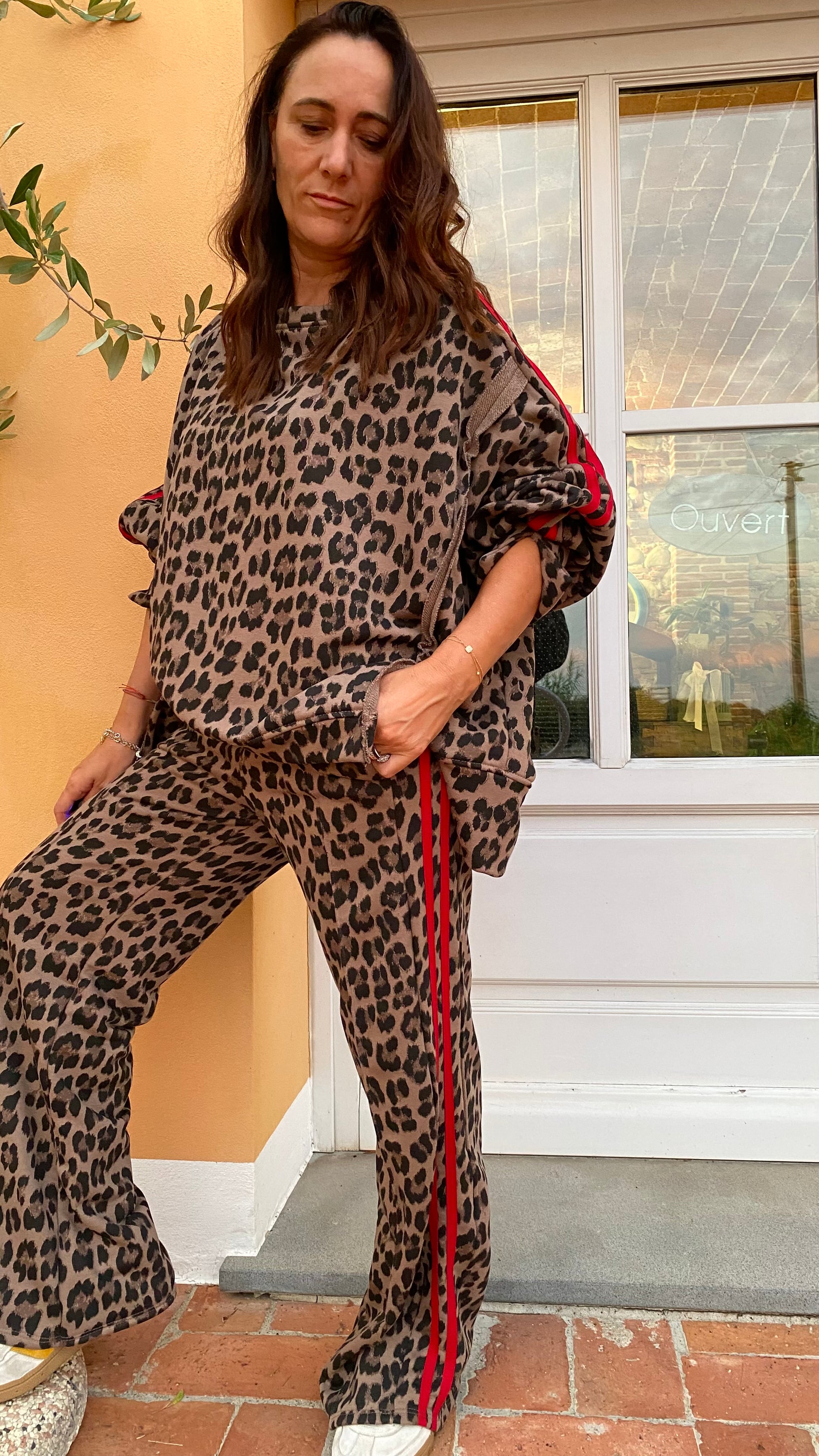 Bellissimo completo in fantasia maculata con rifiniture rosse.