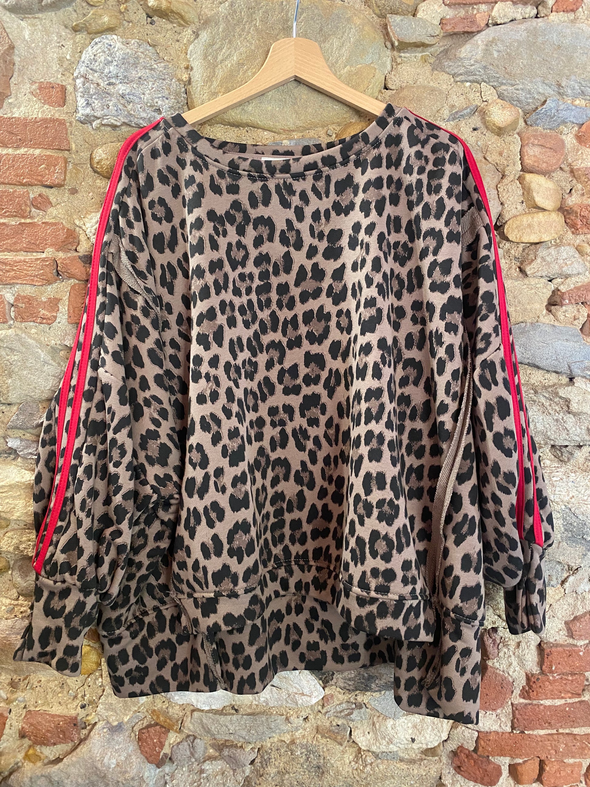 La felpa è una felpa over con spacchi laterali più corta davanti rispetto a dietro, scollo rotondo e maniche a palloncino con finale polsino con piccolo spacchetto, la particolarità sono sicuramente le applicazioni rosse sulle maniche e sul pantalone.