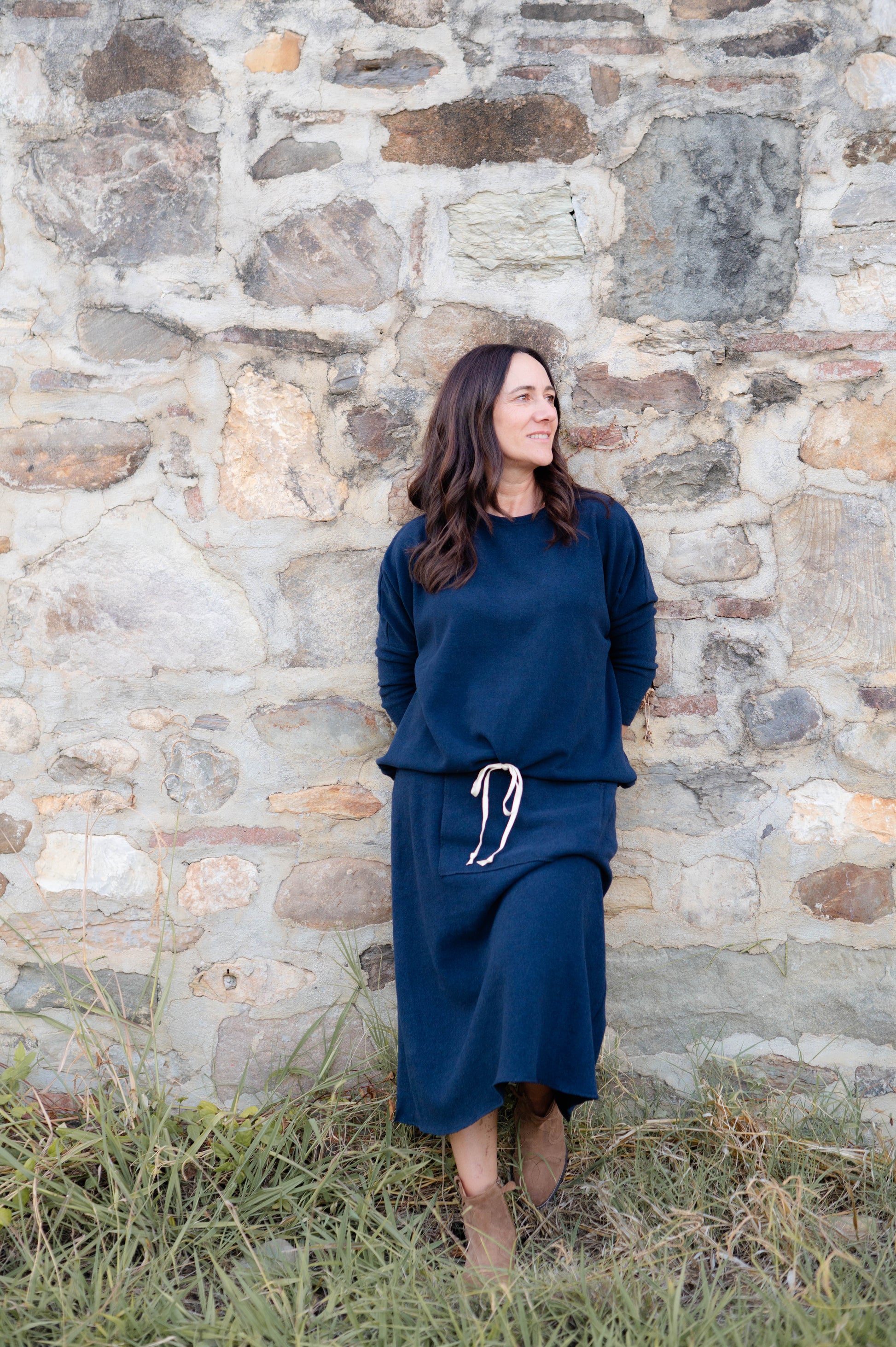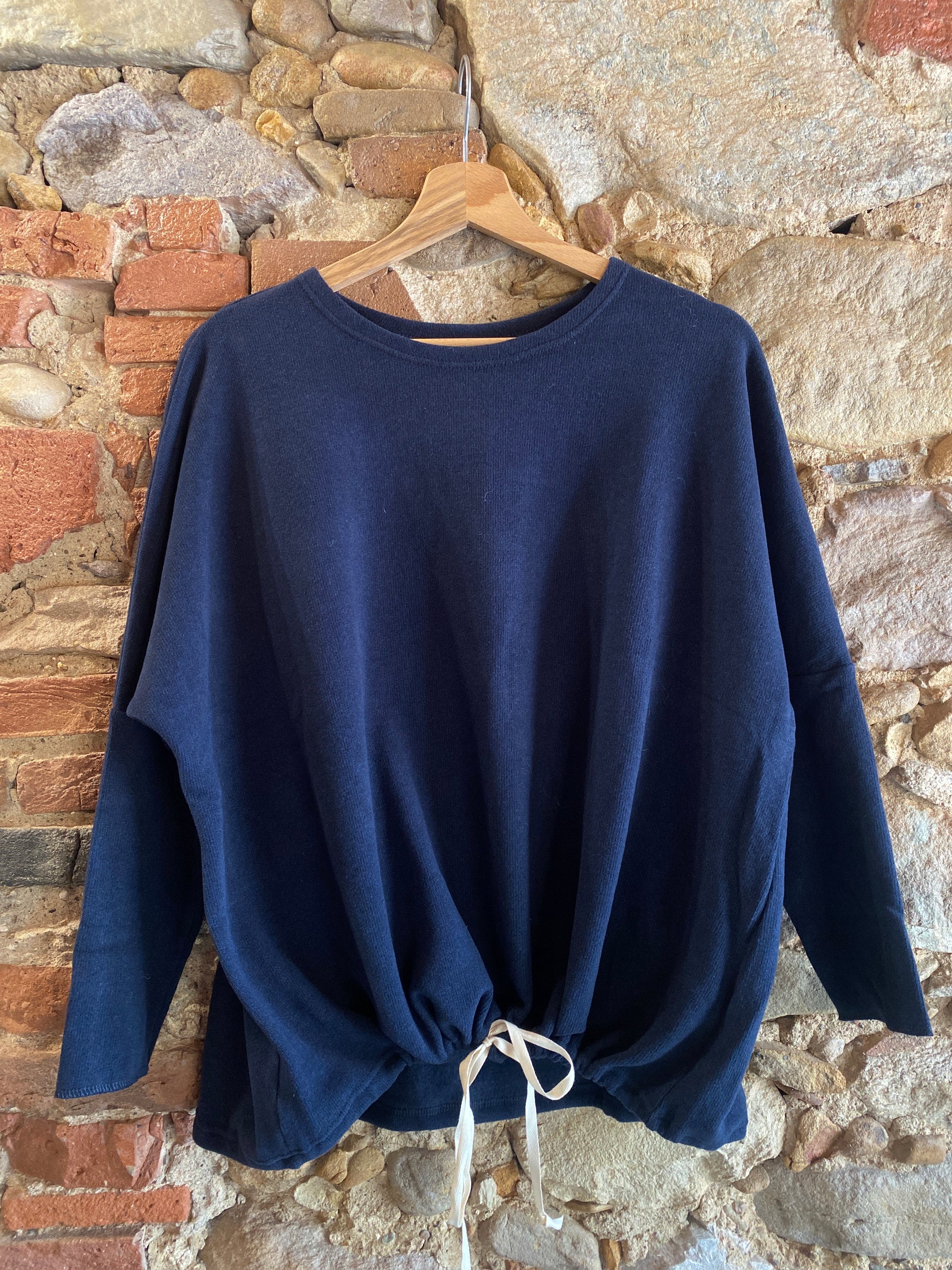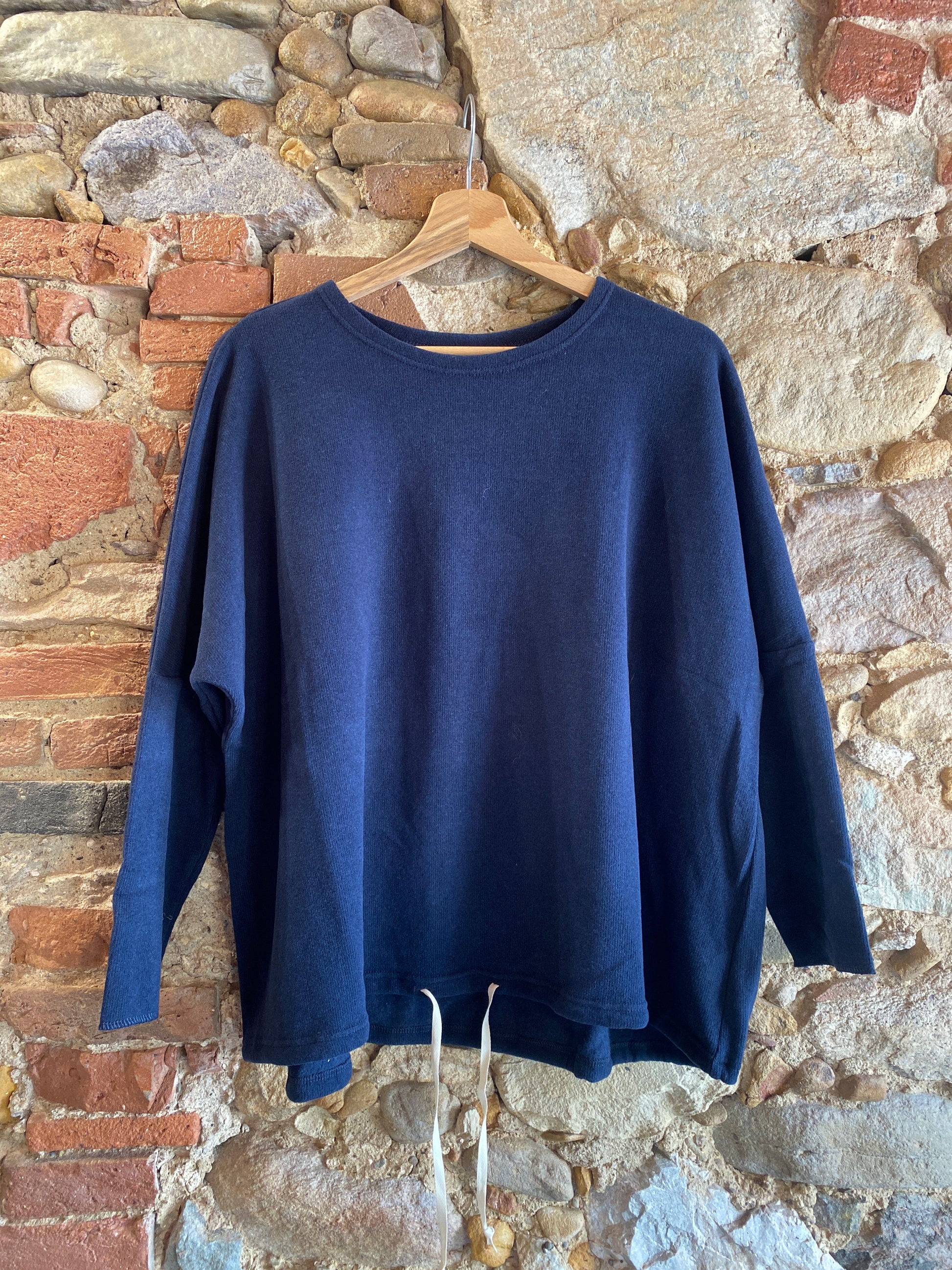 Felpa giro collo, manica lunga, coulisse al fondo che puoi regolare a piacere, tessuto caldo cotone blu.