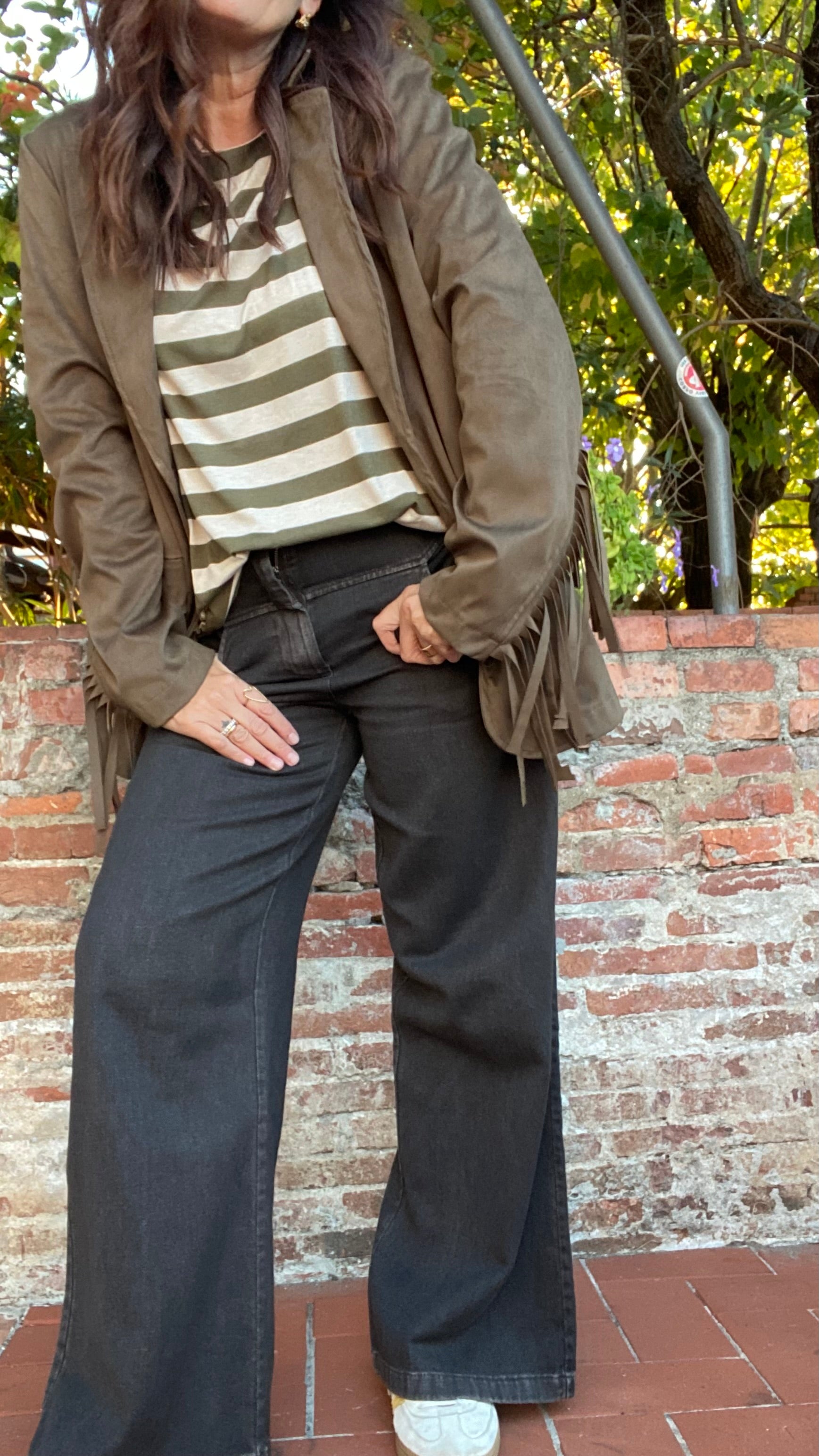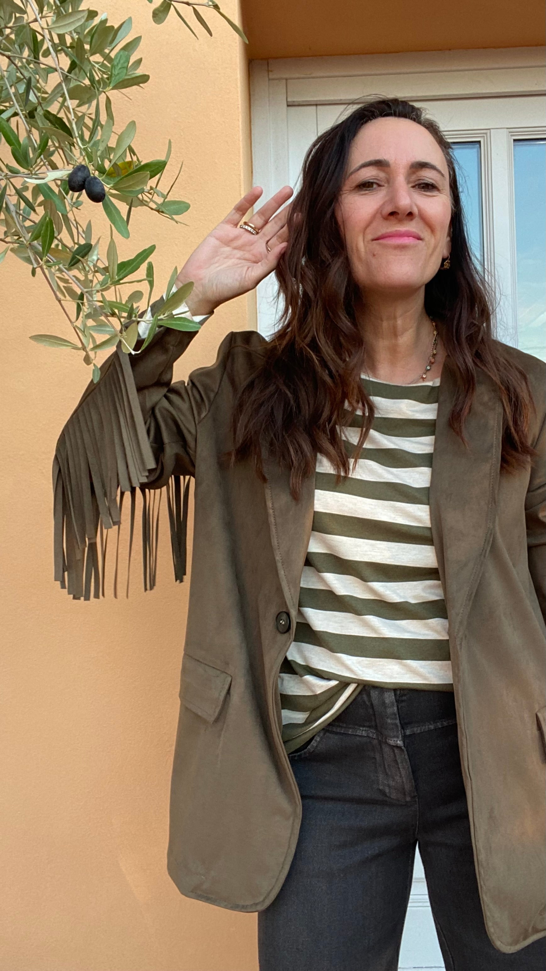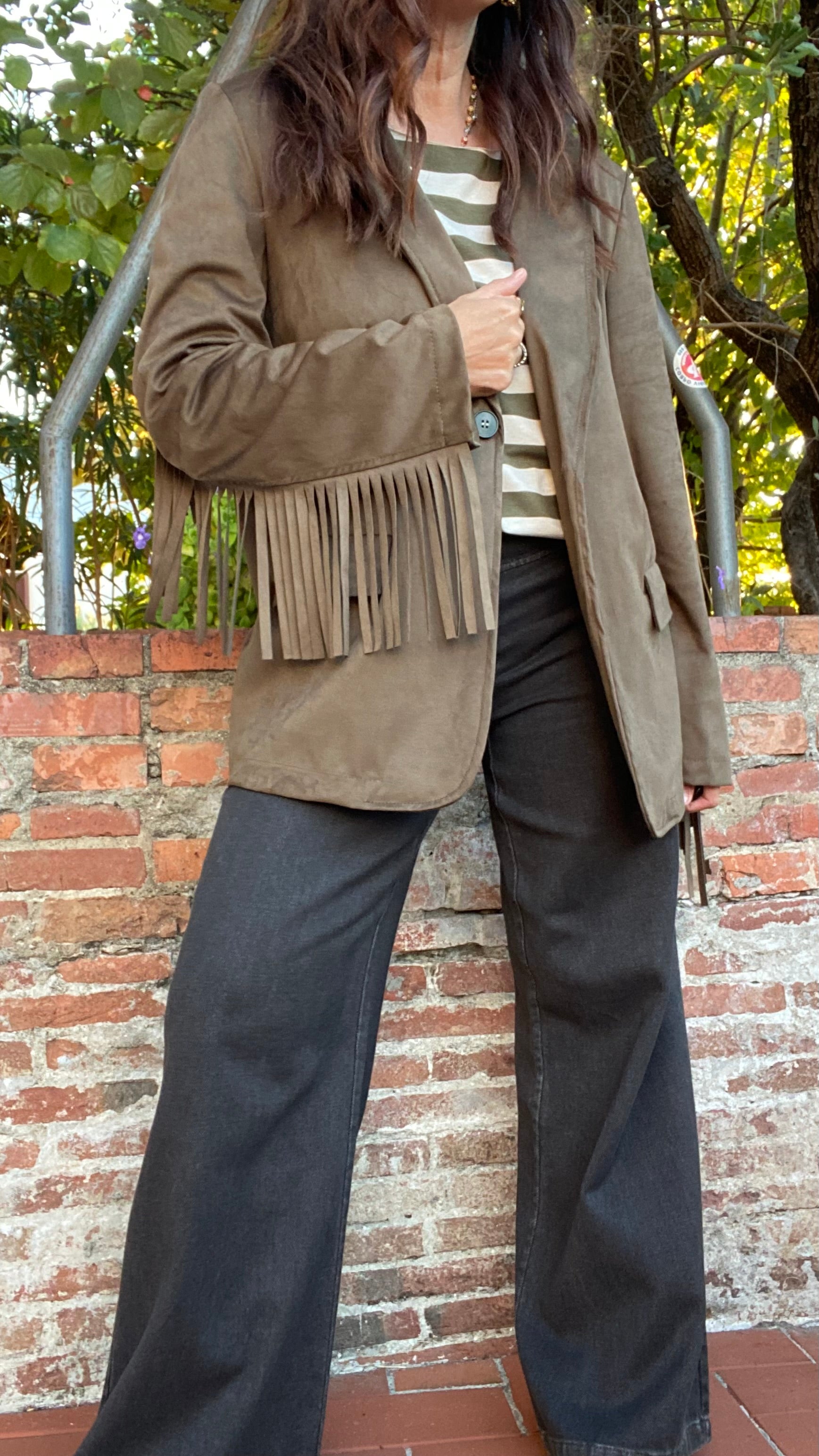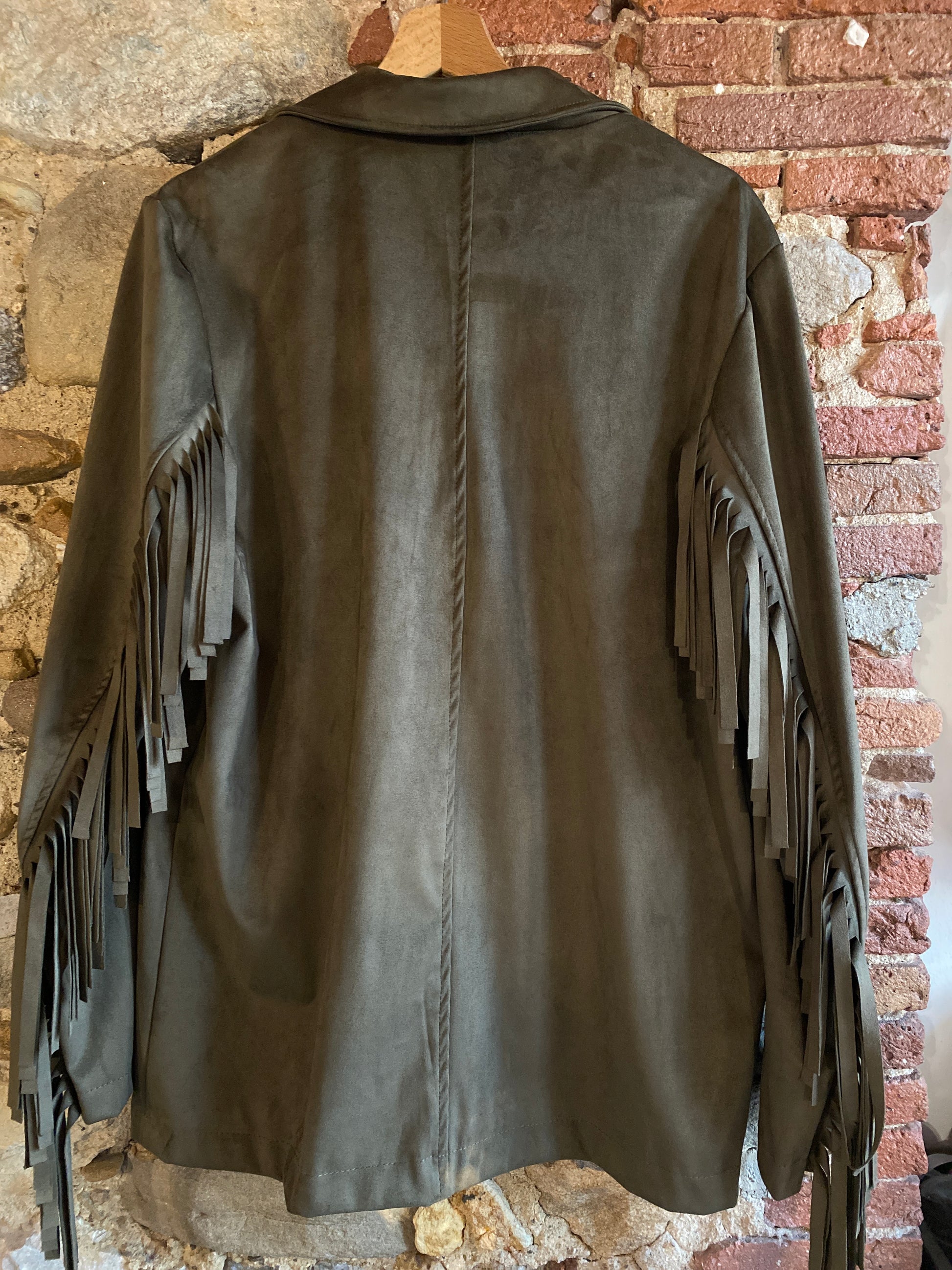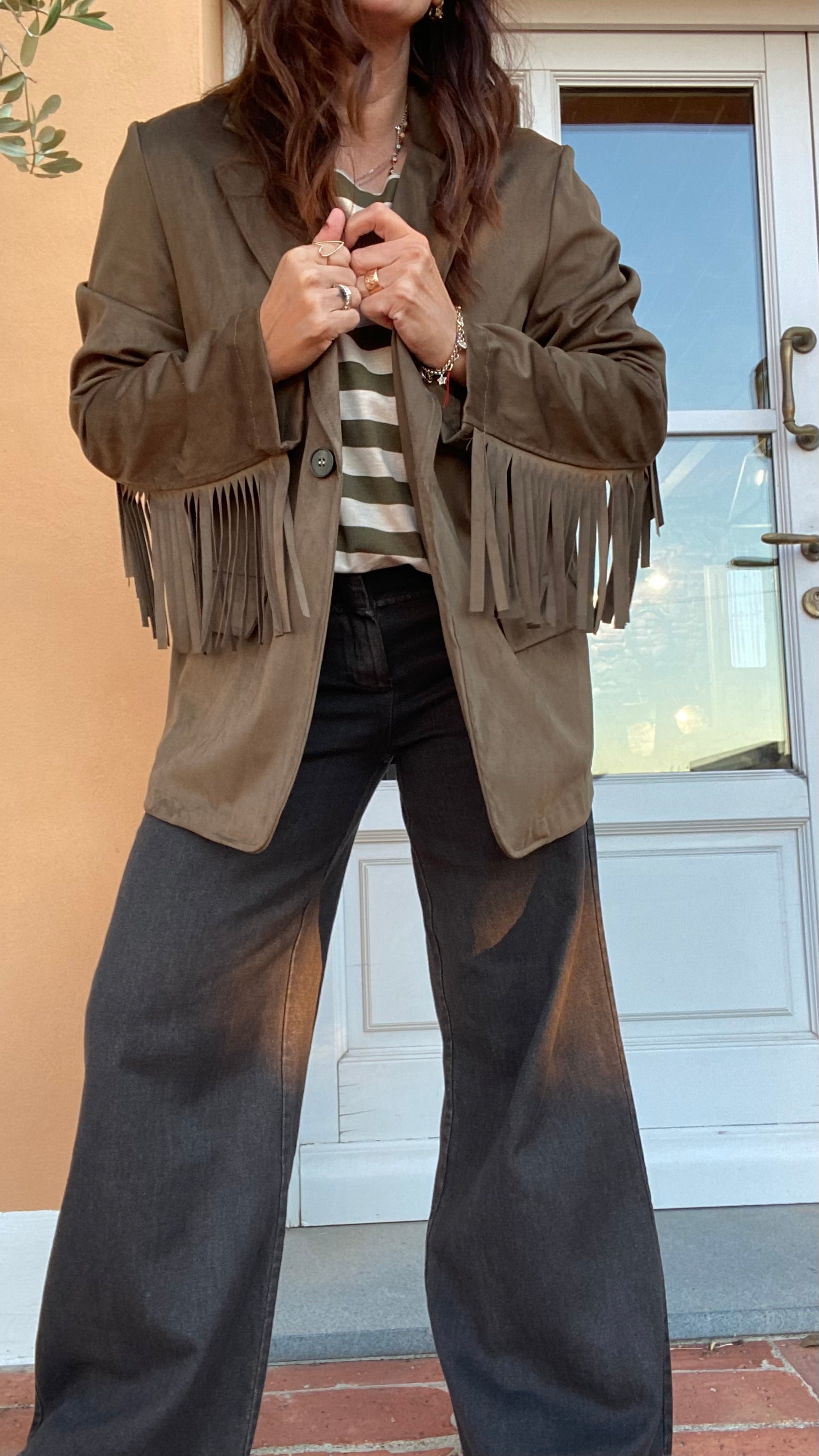 Questa giacca effetto scamosciato, nel raffinato tono del verde oliva, reinterpreta il blazer classico con un tocco boho grazie alle frange lungo le maniche. Morbida al tatto e dal taglio fluido, è perfetta per aggiungere personalità anche ai look più semplici.