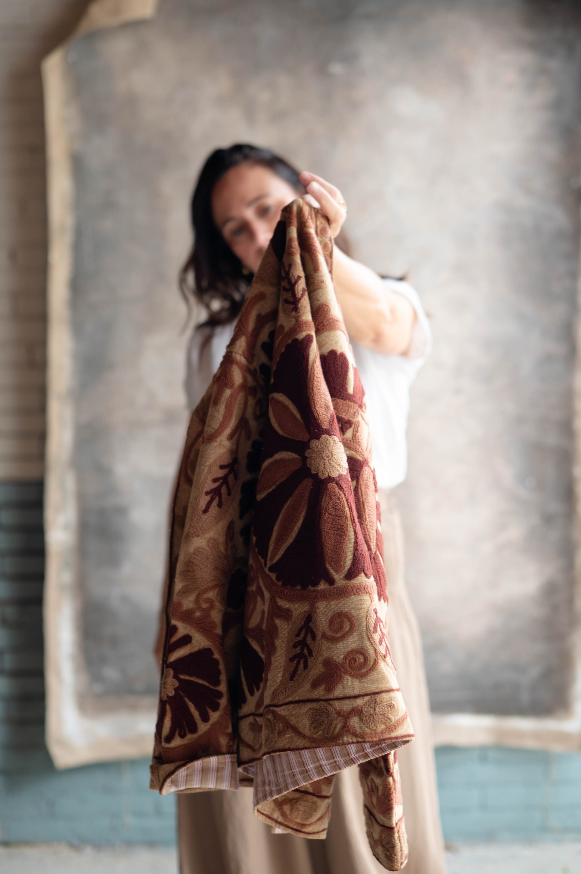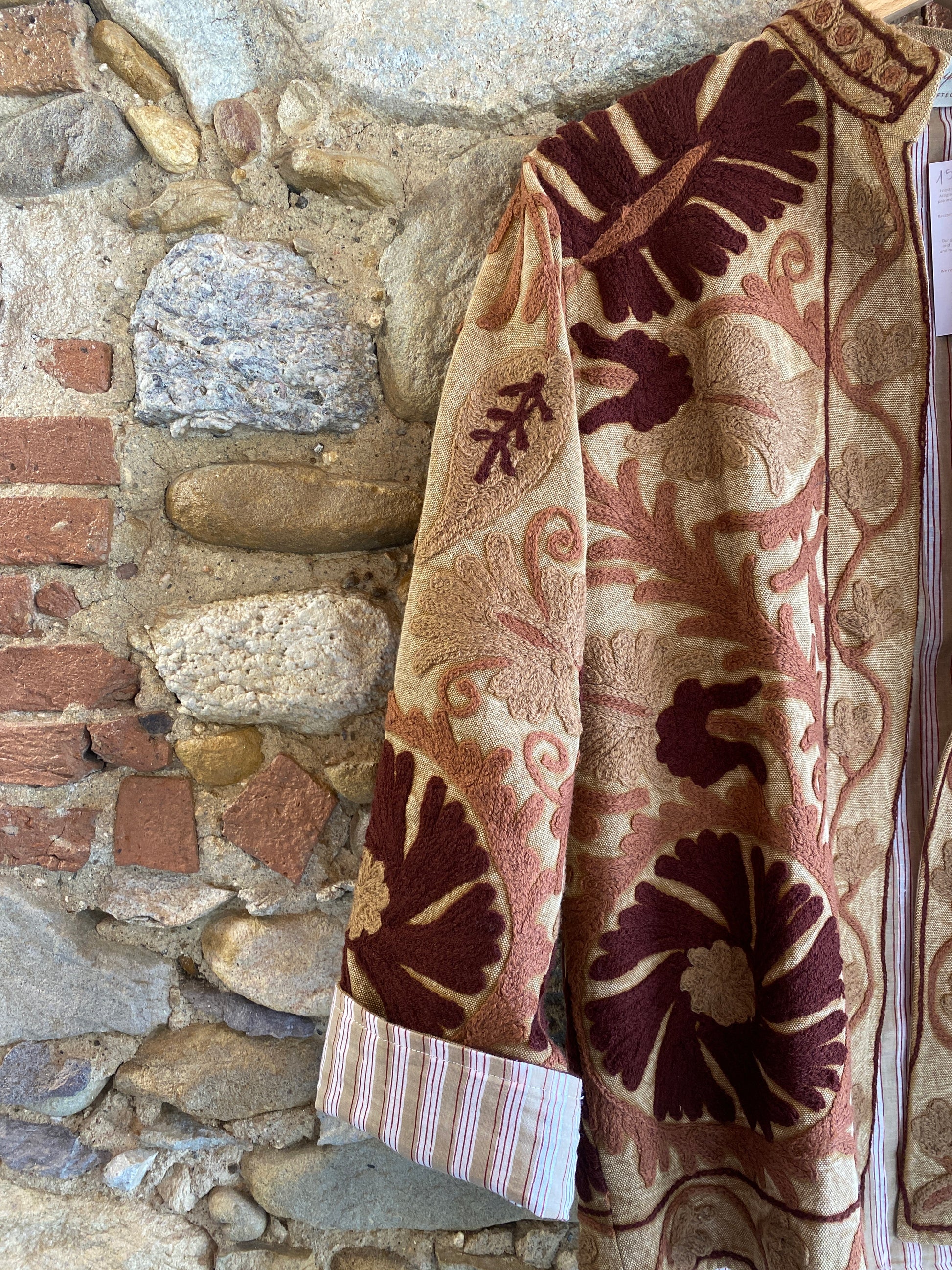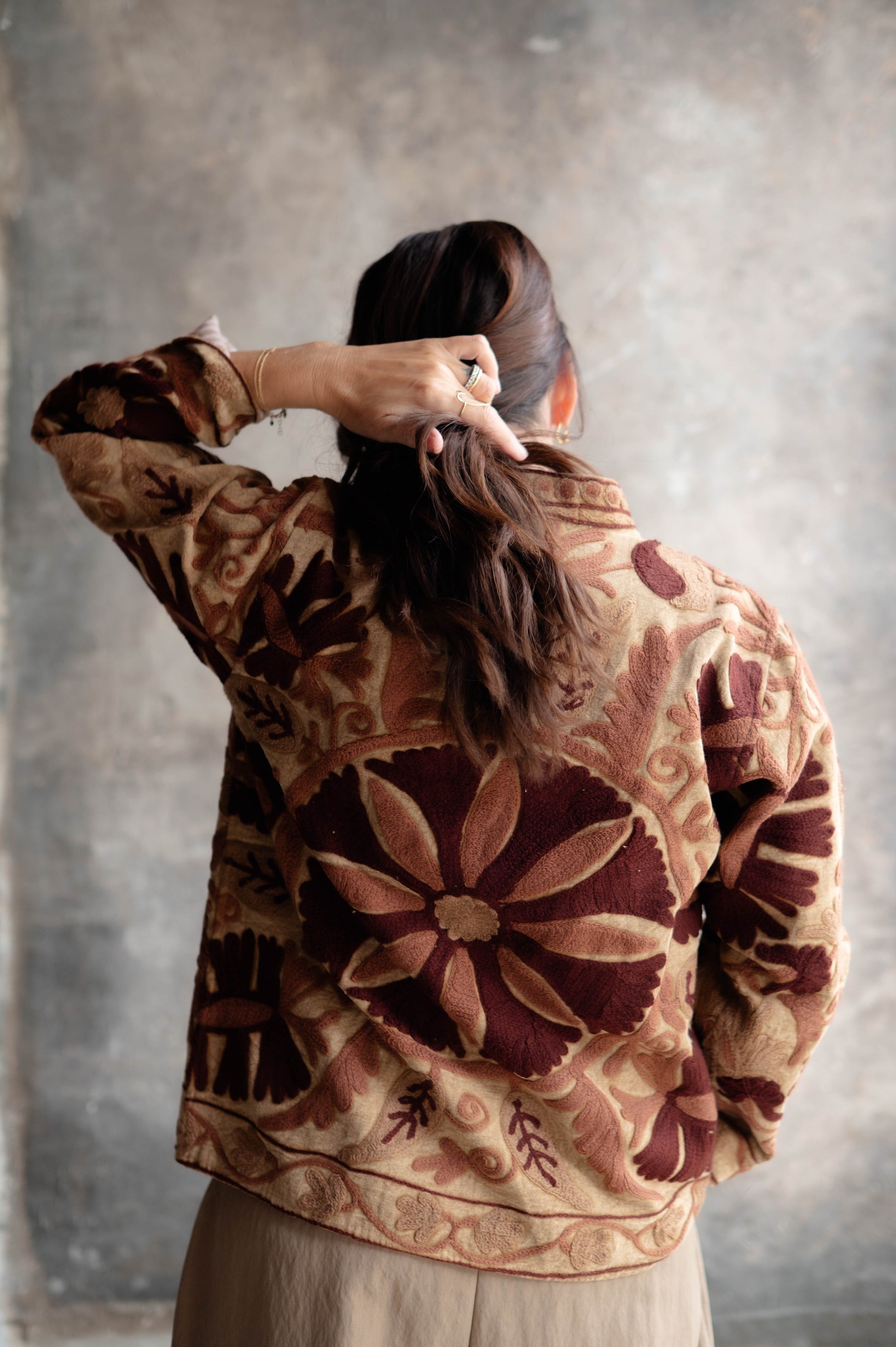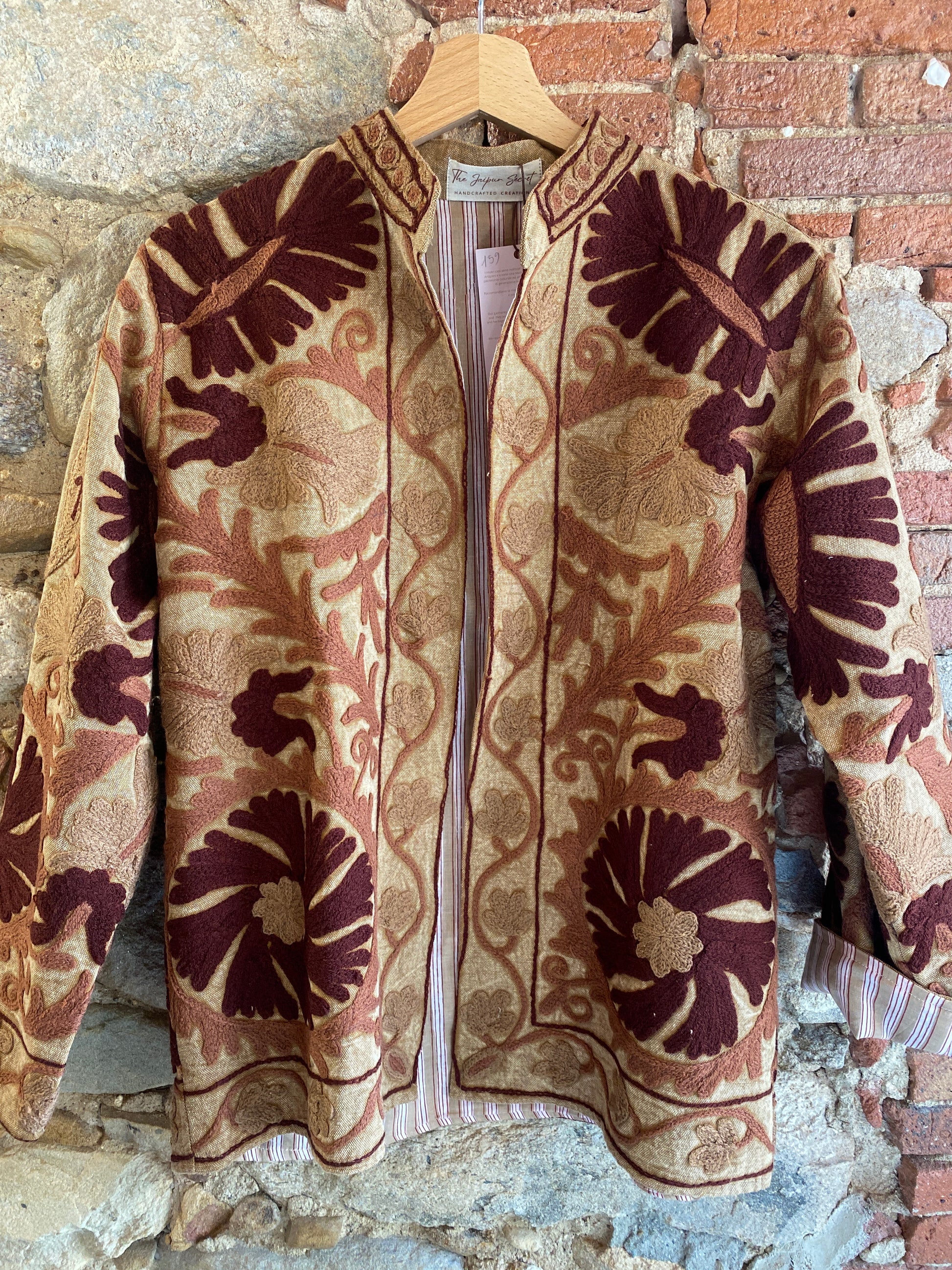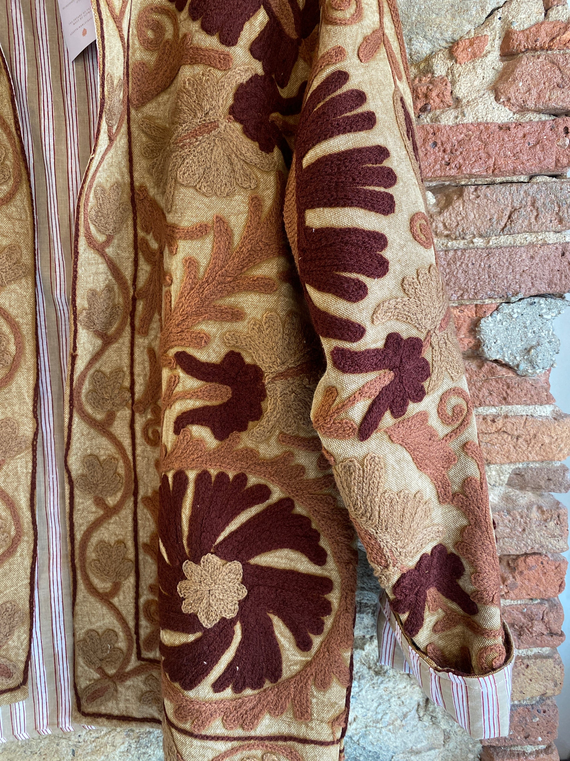 Un pezzo unico che non passa inosservato Giacca artigianale realizzata a Jaipur, ricamata interamente a mano secondo la tradizione Suzani.Base in beige caldo con ricami floreali nei toni del bordeaux, marrone bruciato e tocchi di rosa antico..Un mix di colori naturali e raffinati che valorizzano ogni outfit.Taglio dritto e morbido, fodera interna a righe, ogni capo è un pezzo unico.