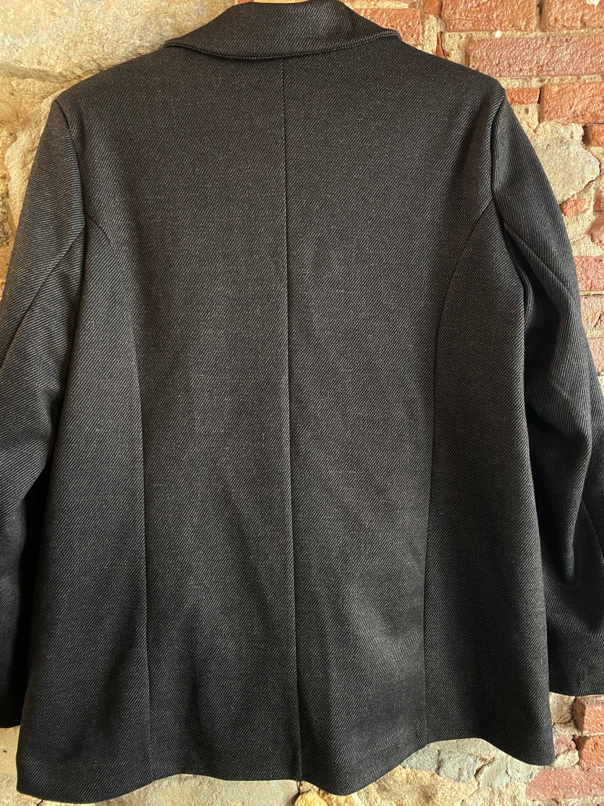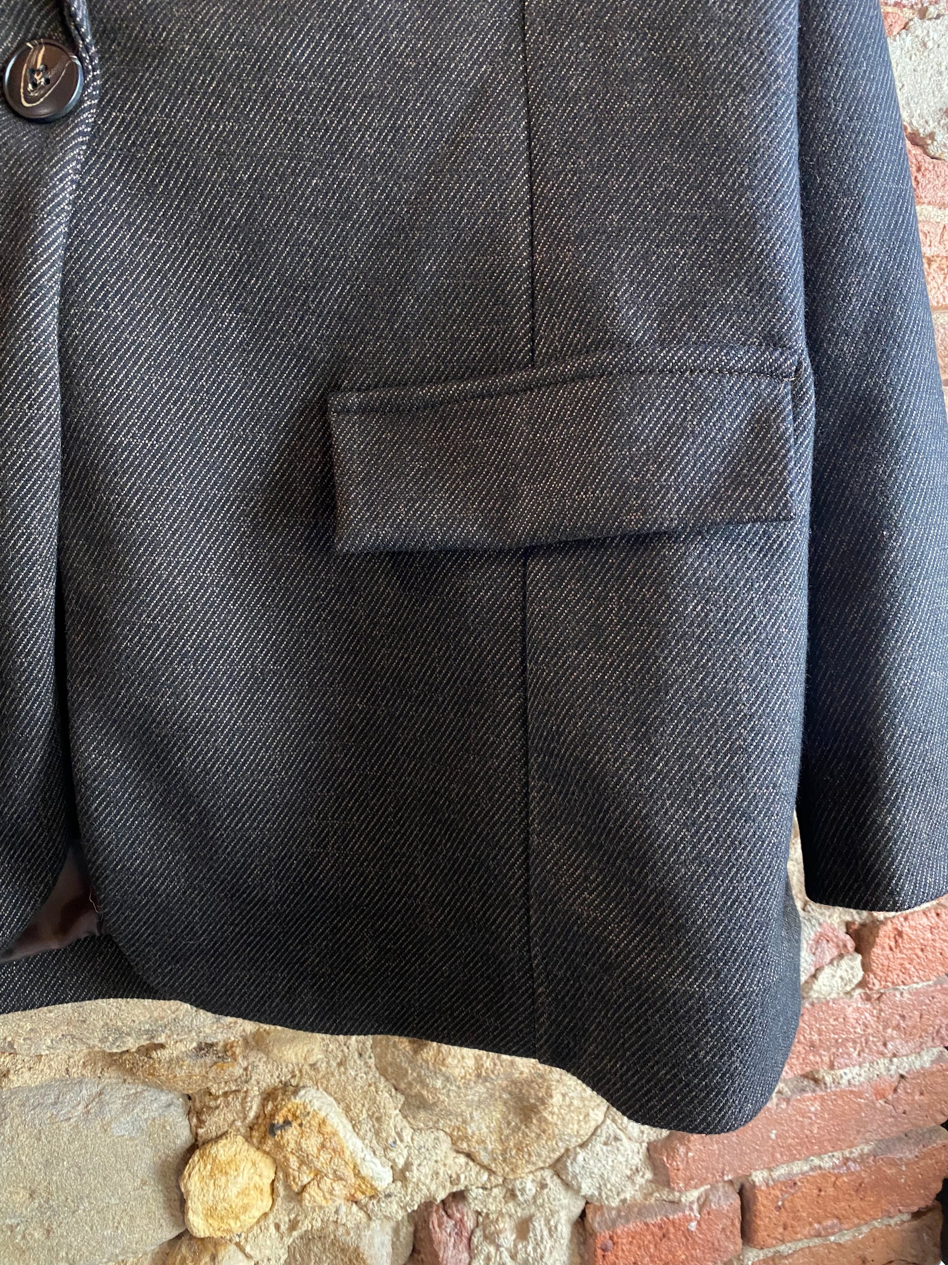 Raffinata e senza tempo, questa giacca spigata antracite incarna la perfetta unione tra stile e comfort.Realizzata in un tessuto caldo e strutturato, è il capo ideale per affrontare la stagione con eleganza disinvolta.Il taglio leggermente over la rende versatile: puoi indossarla su un denim per un look più casual o su un pantalone dal taglio maschile per un effetto più sofisticato.La trama a spina di pesce — discreta ma distintiva — aggiunge profondità e carattere, rendendola un pezzo chiave del guardaroba autunnale.