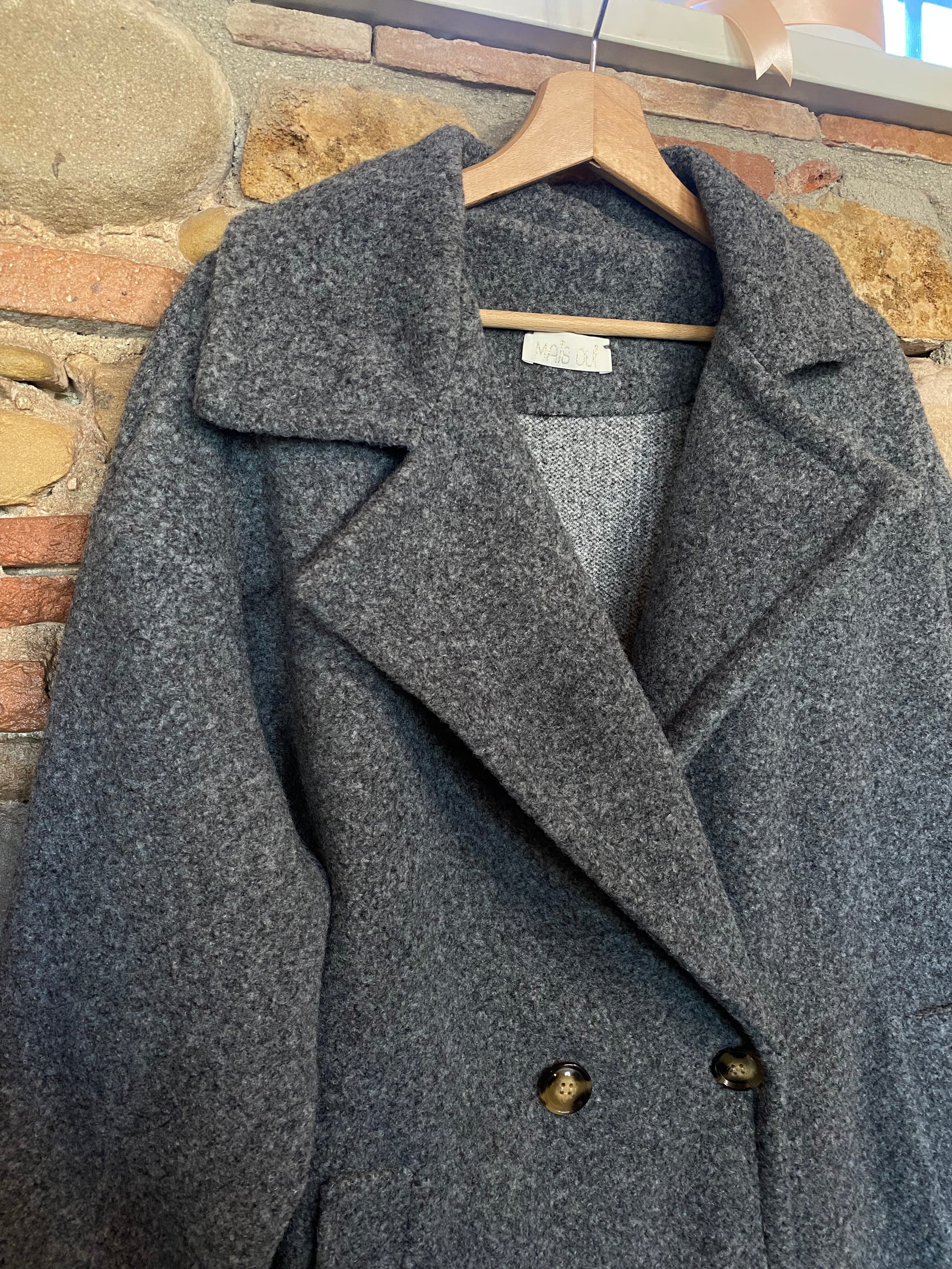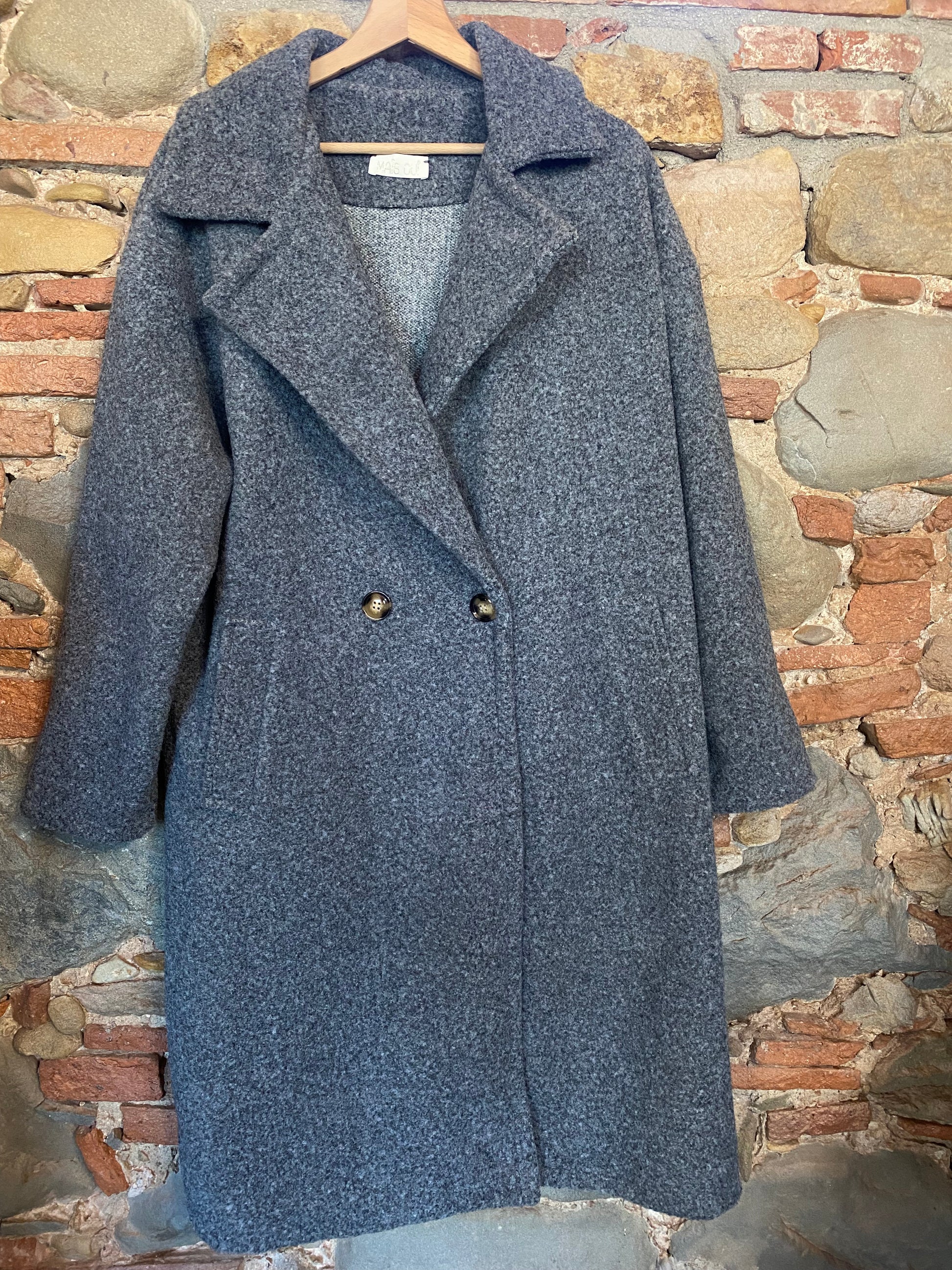 Un capo che fa la differenza.Realizzato in morbido panno grigio, questo cappotto presenta una linea dritta e leggermente over, perfetta da portare anche sopra maglioni e blazer.Il dettaglio del finto doppio petto — due bottoni visibili ma chiusura interna a un solo bottone — gli dona carattere senza appesantire la silhouette, mantenendo un aspetto pulito e sofisticato.Un cappotto versatile, da indossare ogni giorno: con un denim e sneakers per un look casual chic, oppure sopra un abito per un’eleganza rilassata.