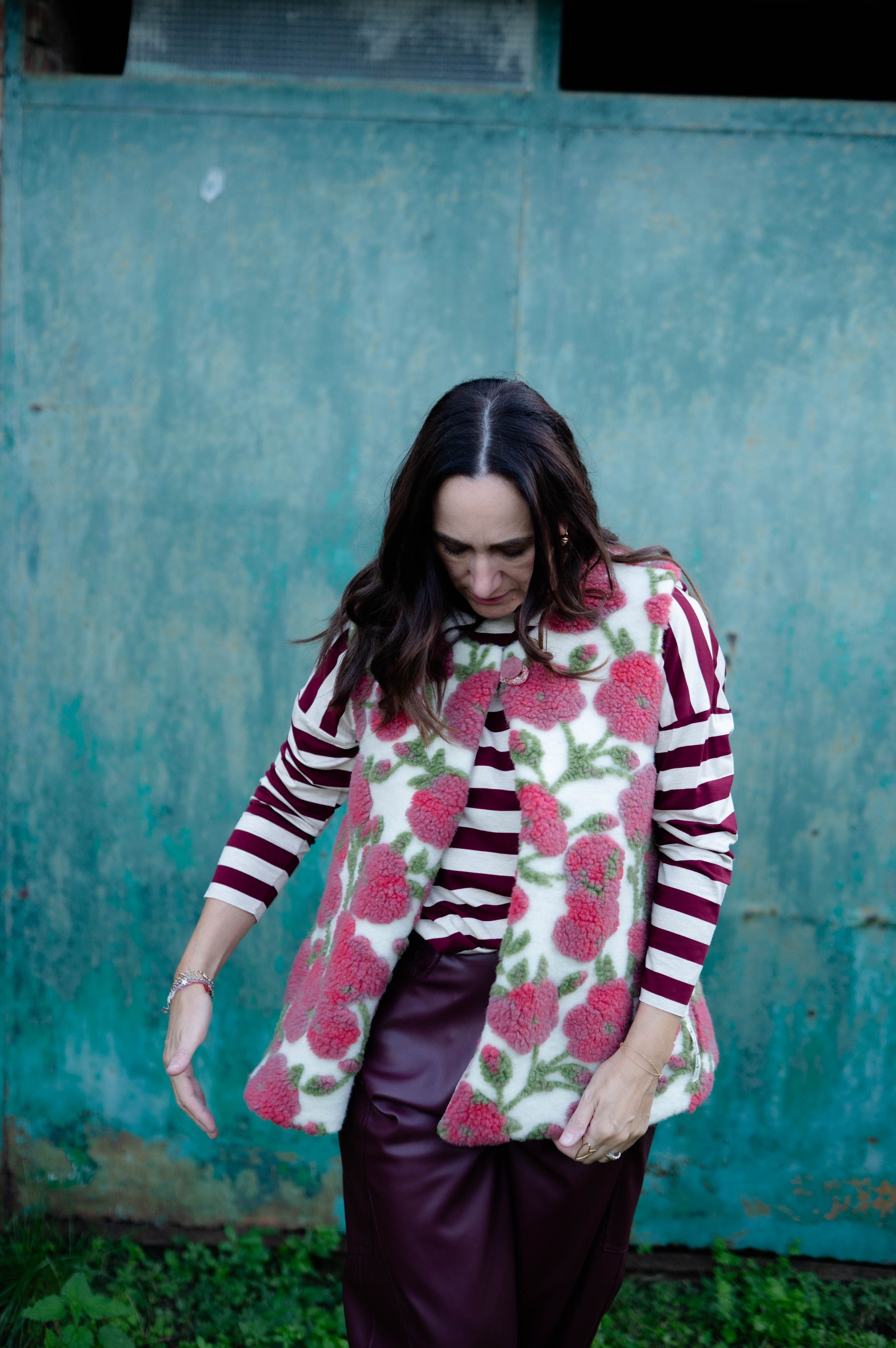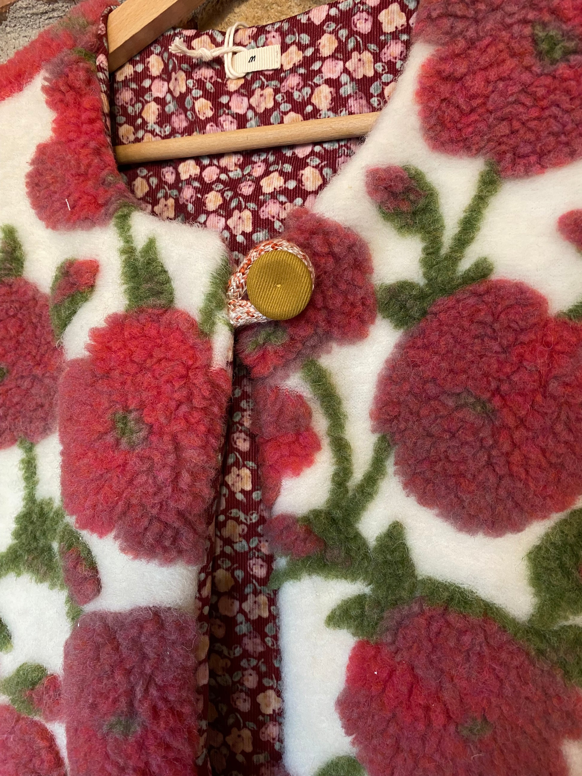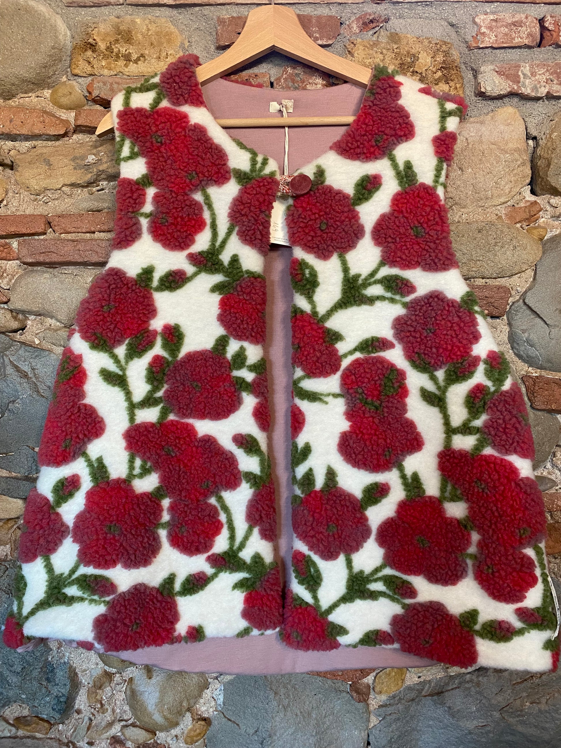 Gilet in morbido pannò effetto lana con motivo floreale rosso e verde su base écru, completamente foderato all’interno in stoffa tartan a contrasto.