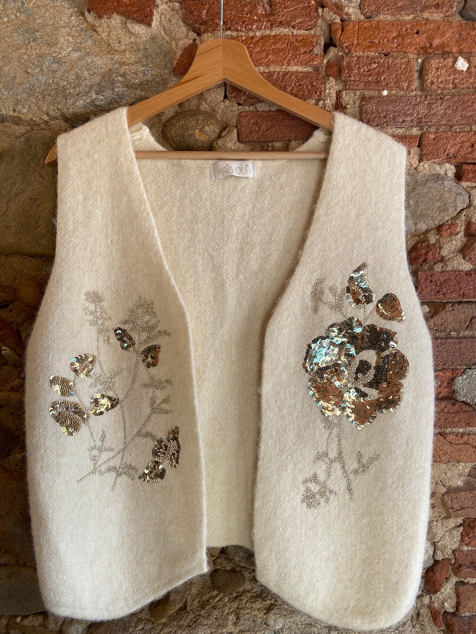 Morbidissimo gilet con dettaglio fiori in paillettes dorate.