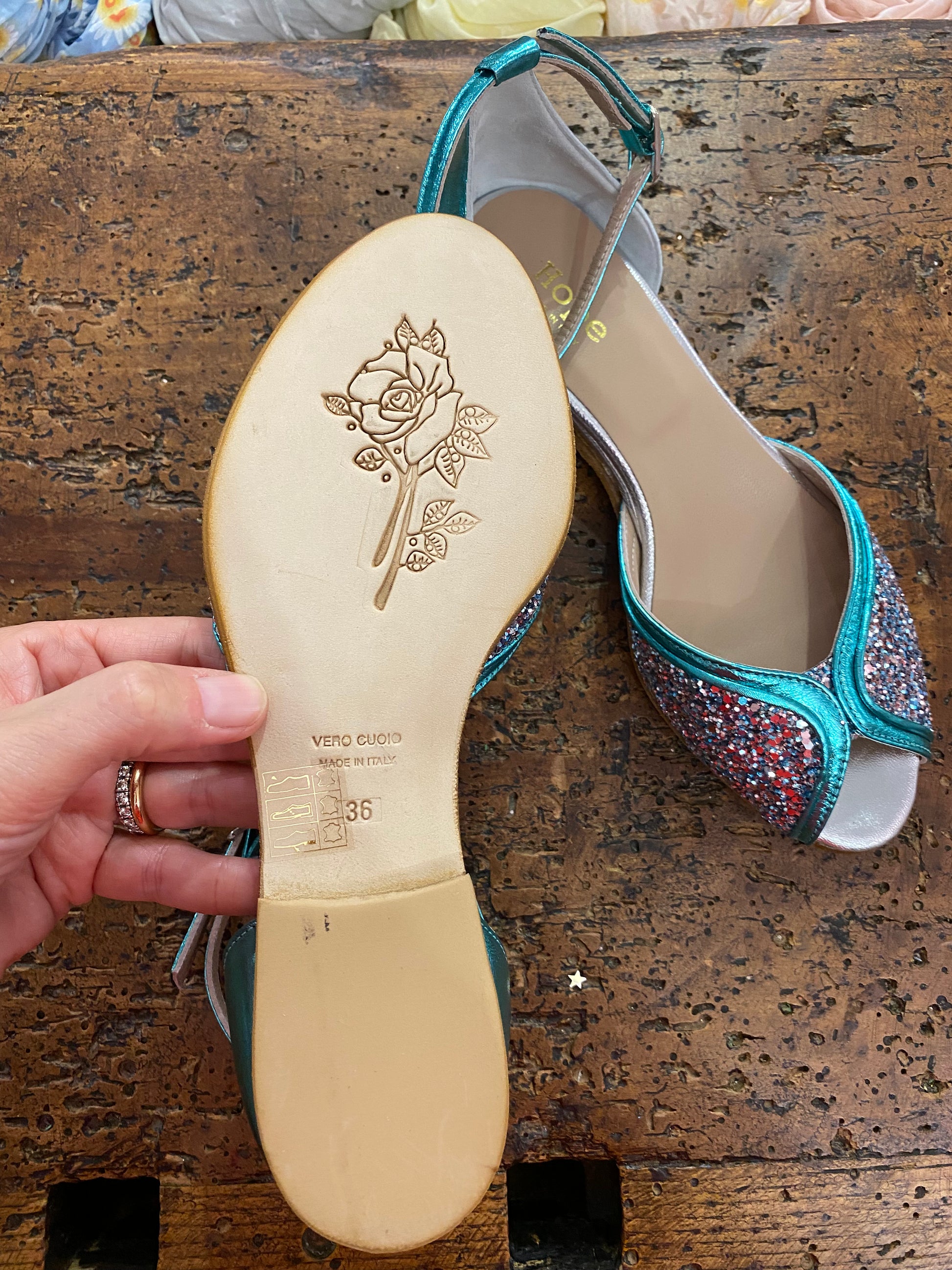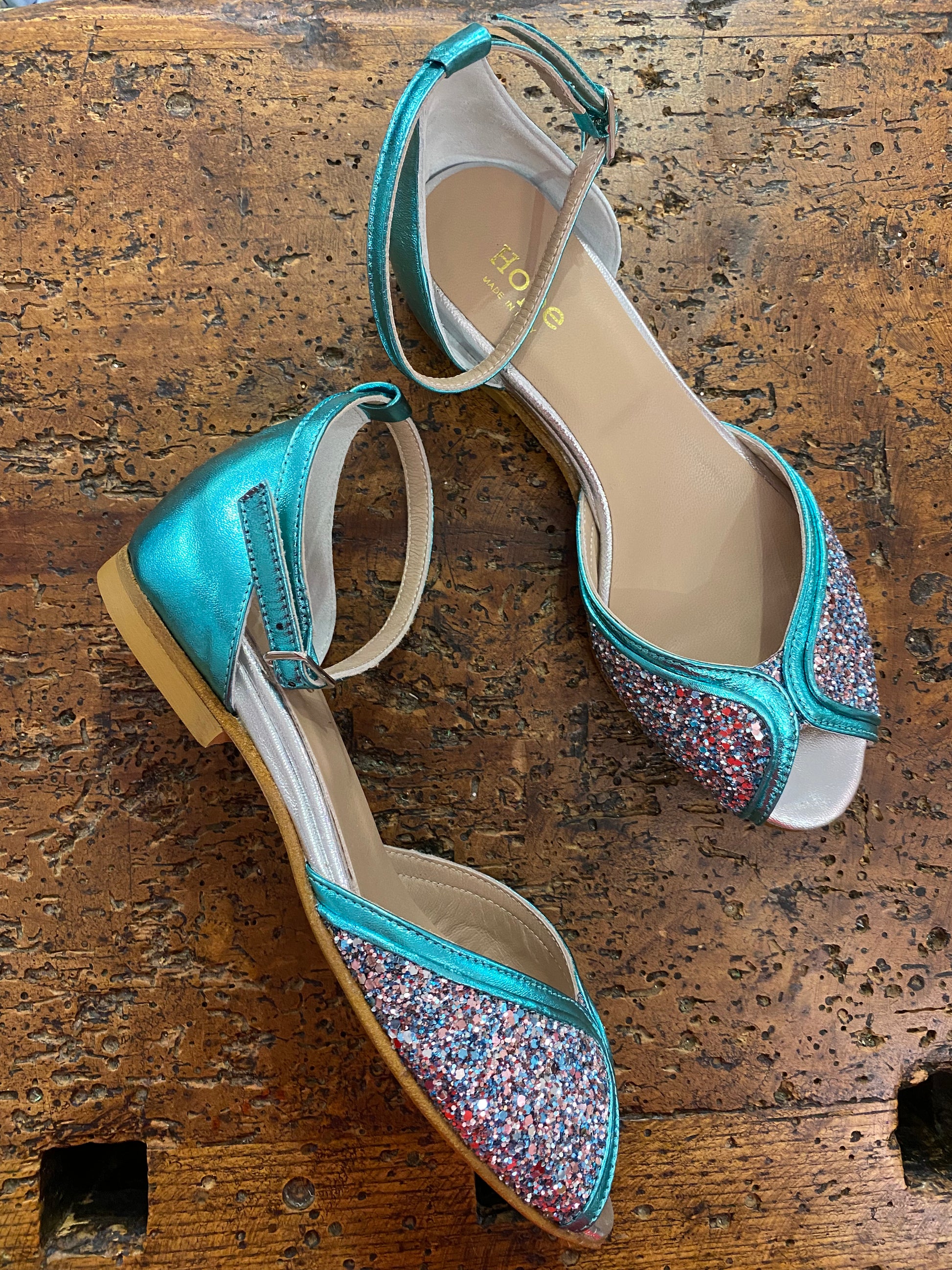 Sandalo in vera pelle colore glitter argento e verde acqua.