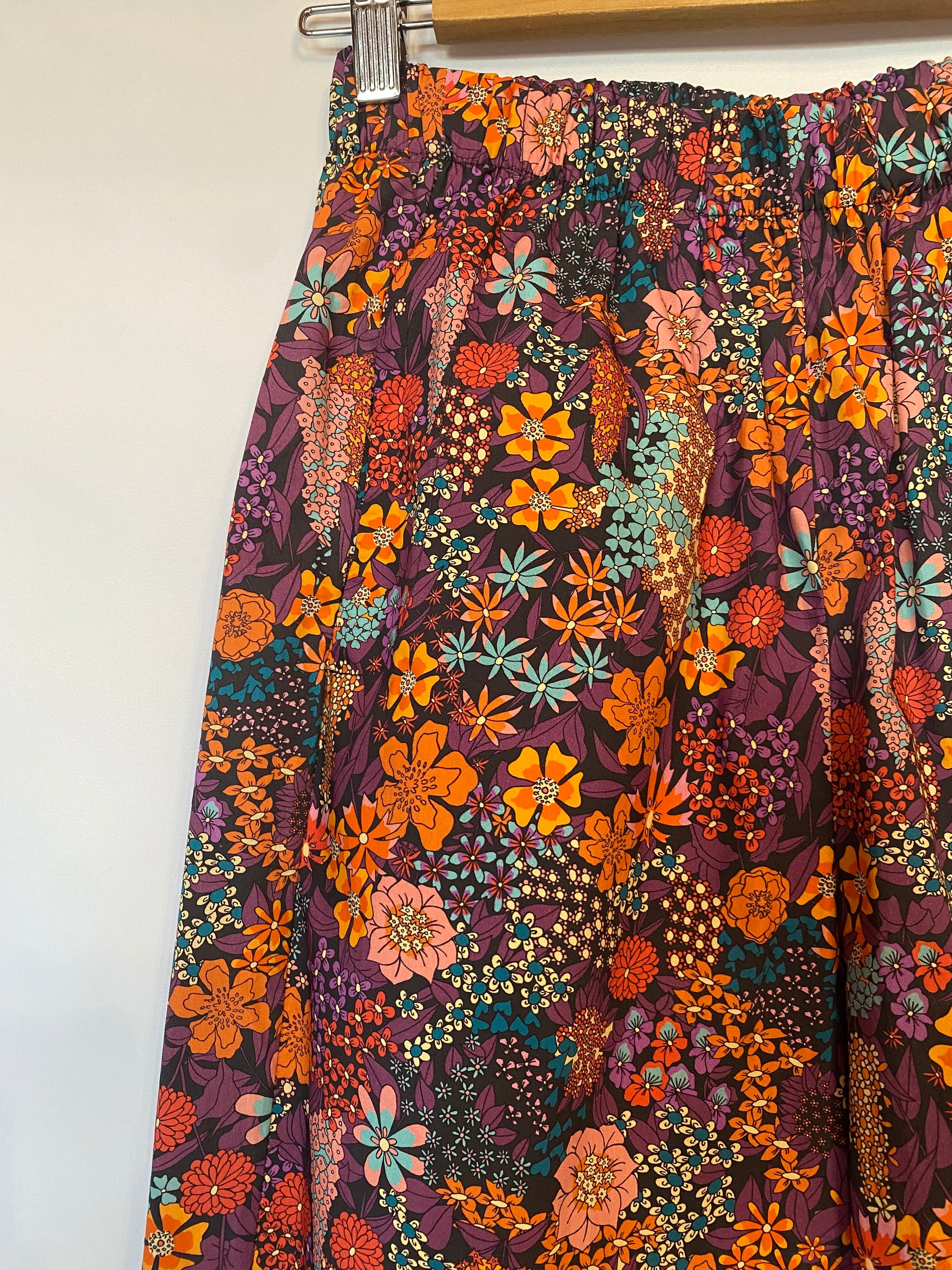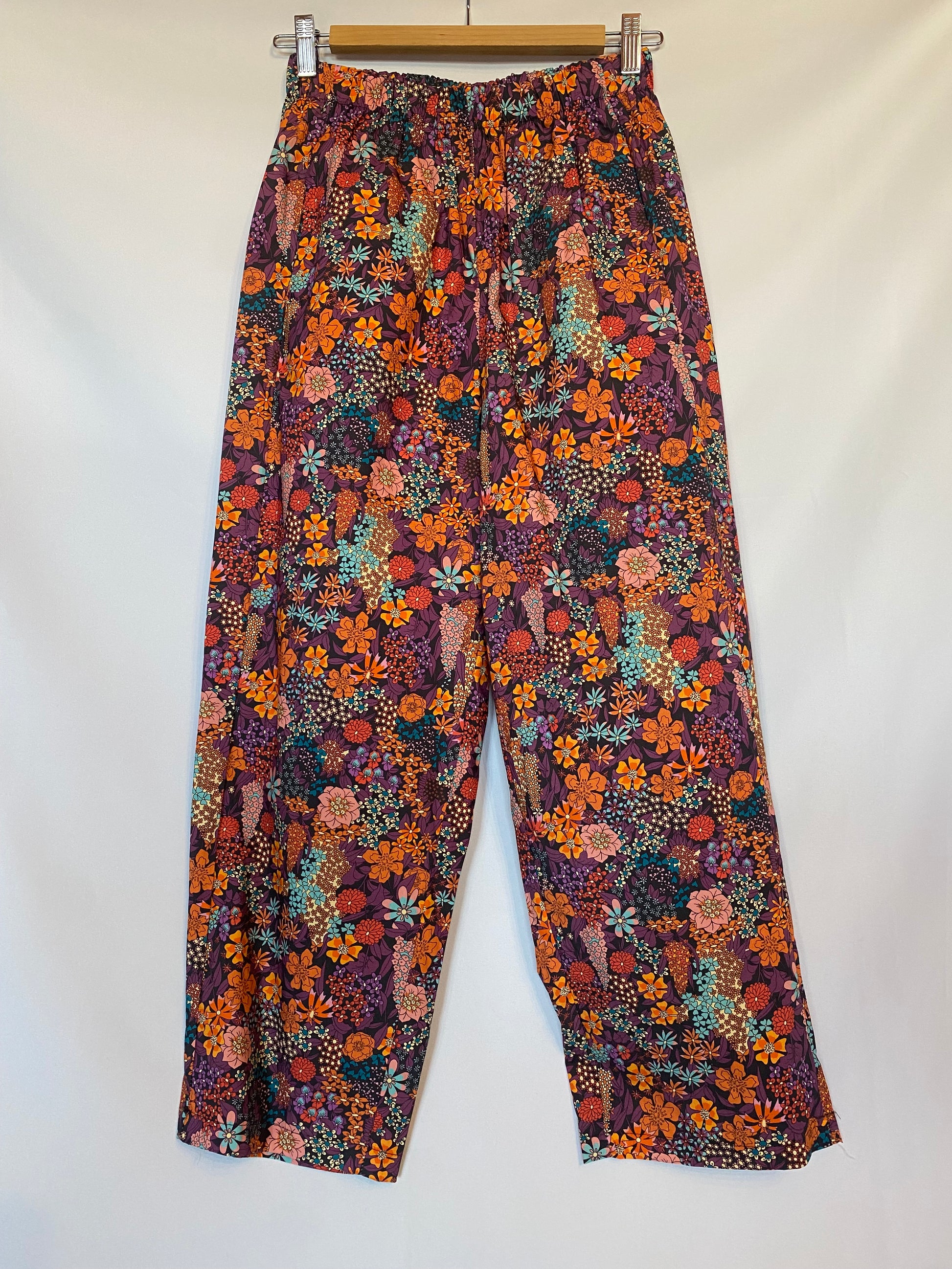 Pantalone in cotone fantasia floreale toni viola, con elastico in vita e tasche laterali.