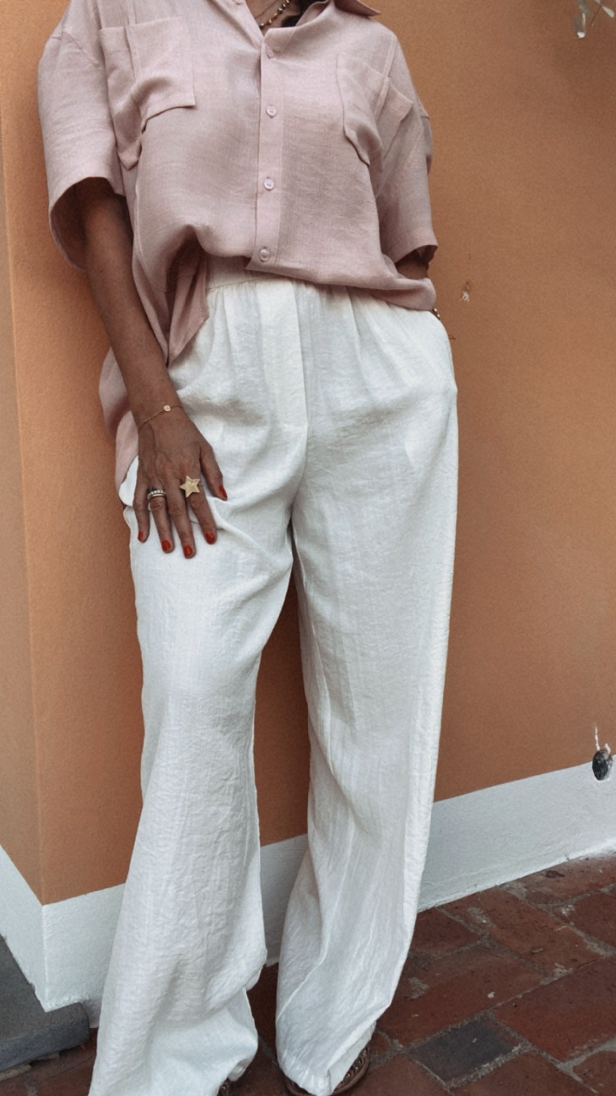 Elastico in vita, tasche laterali e tasca dietro, molto leggero e fluido.