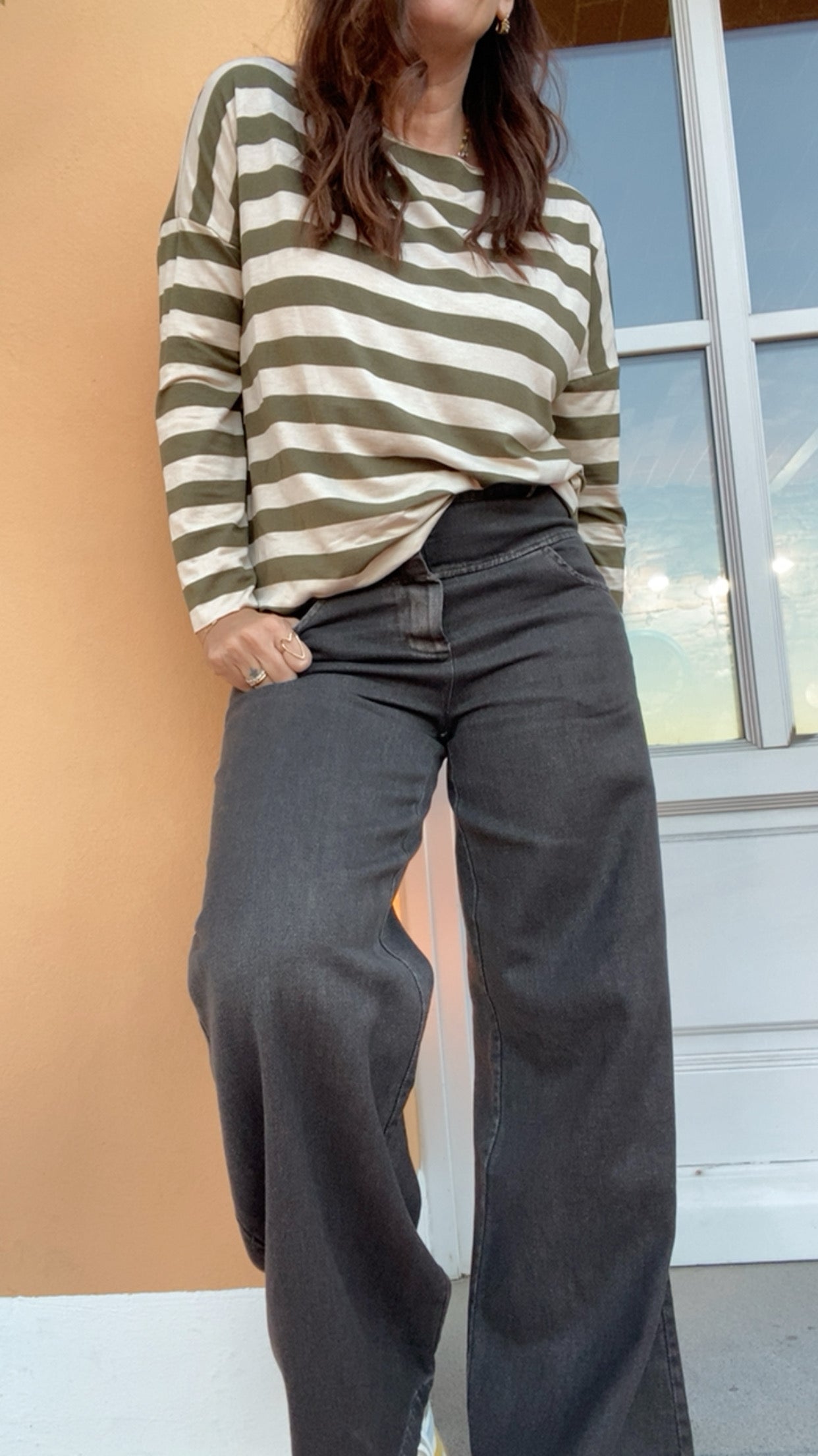 Modello dal fit comodo, manica lunga, spalla scesa scollo a barca.