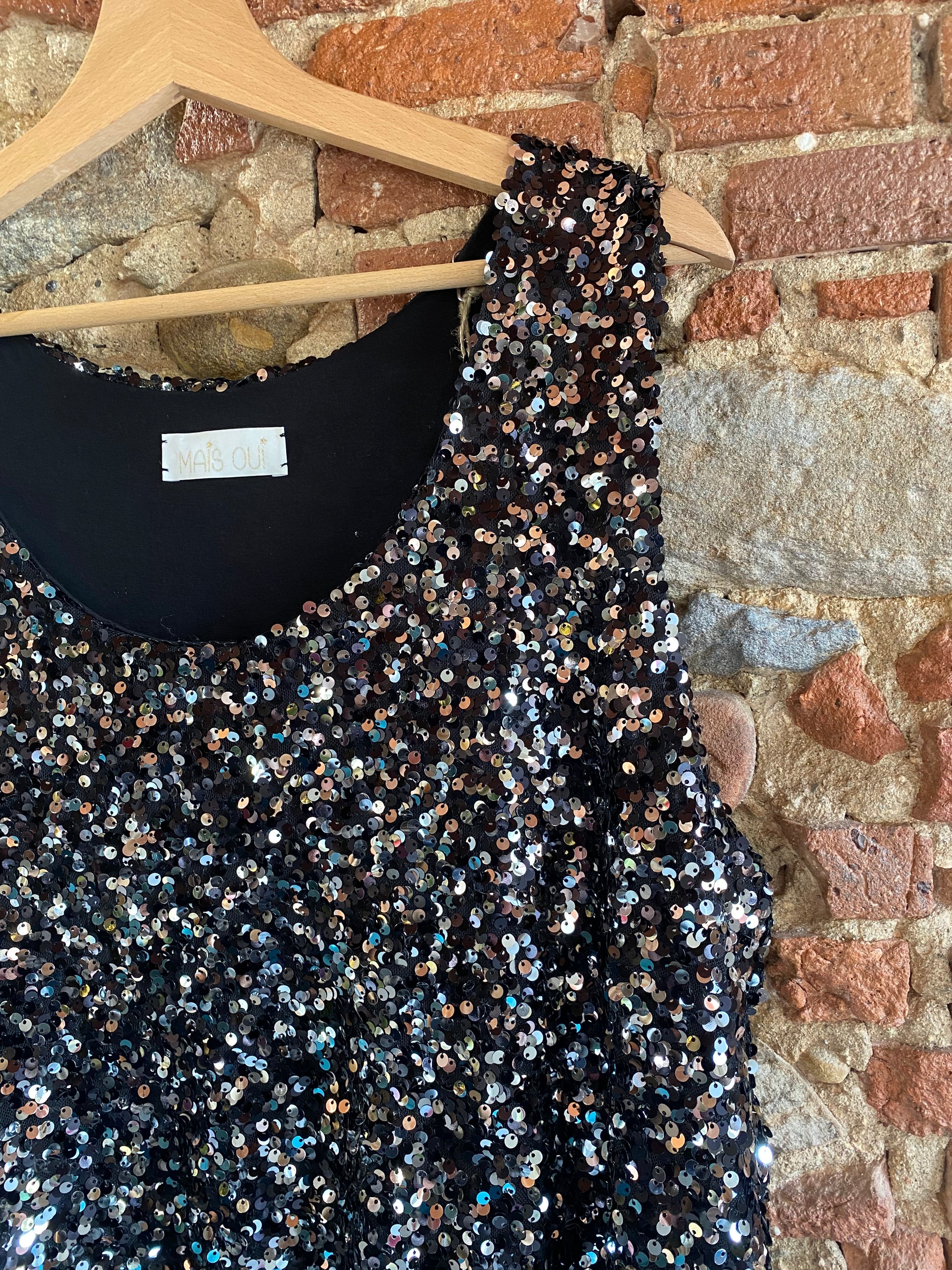 Il top Samanta colore black è una piccola bomba di luce: interamente in paillettes, con riflessi freddi e caldi che cambiano a ogni movimento. Il taglio è essenziale, morbido, con spallina larga e scollo pulito: zero eccessi, solo brillantezza gestita con classe.
