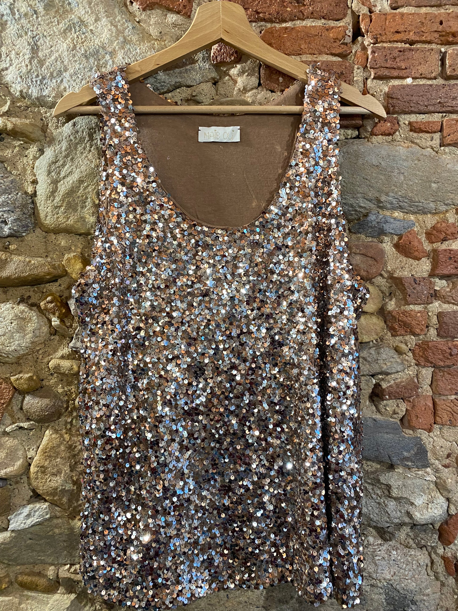 Il top Samanta colore champagne è una piccola bomba di luce: interamente in paillettes bronzo–champagne, con riflessi freddi e caldi che cambiano a ogni movimento. Il taglio è essenziale, morbido, con spallina larga e scollo pulito: zero eccessi, solo brillantezza gestita con classe.